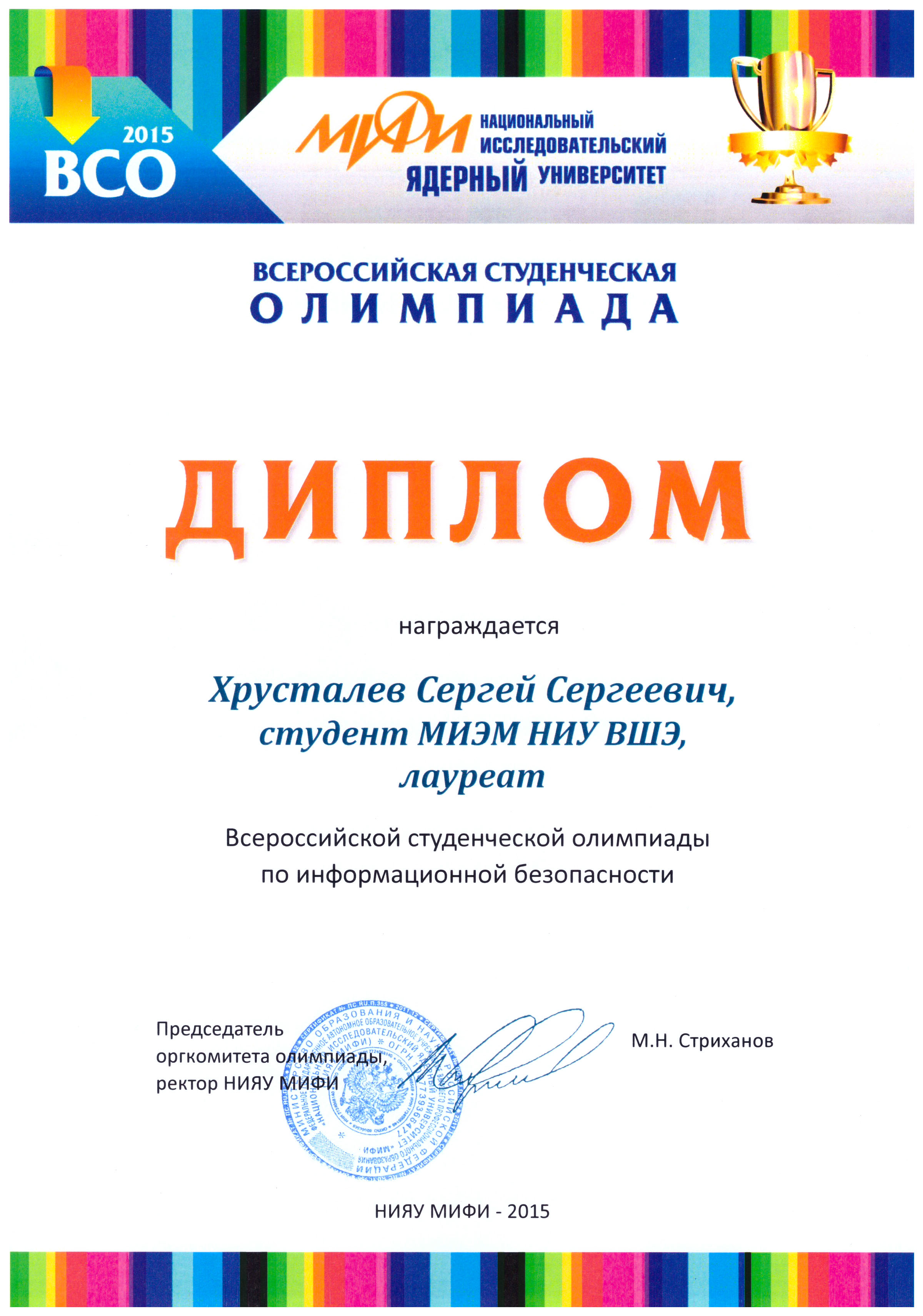 Студент Московского института электроники и математики Сергей Хрусталев был награжден дипломом лауреата всероссийской студенческой олимпиады по информационной безопасности.
