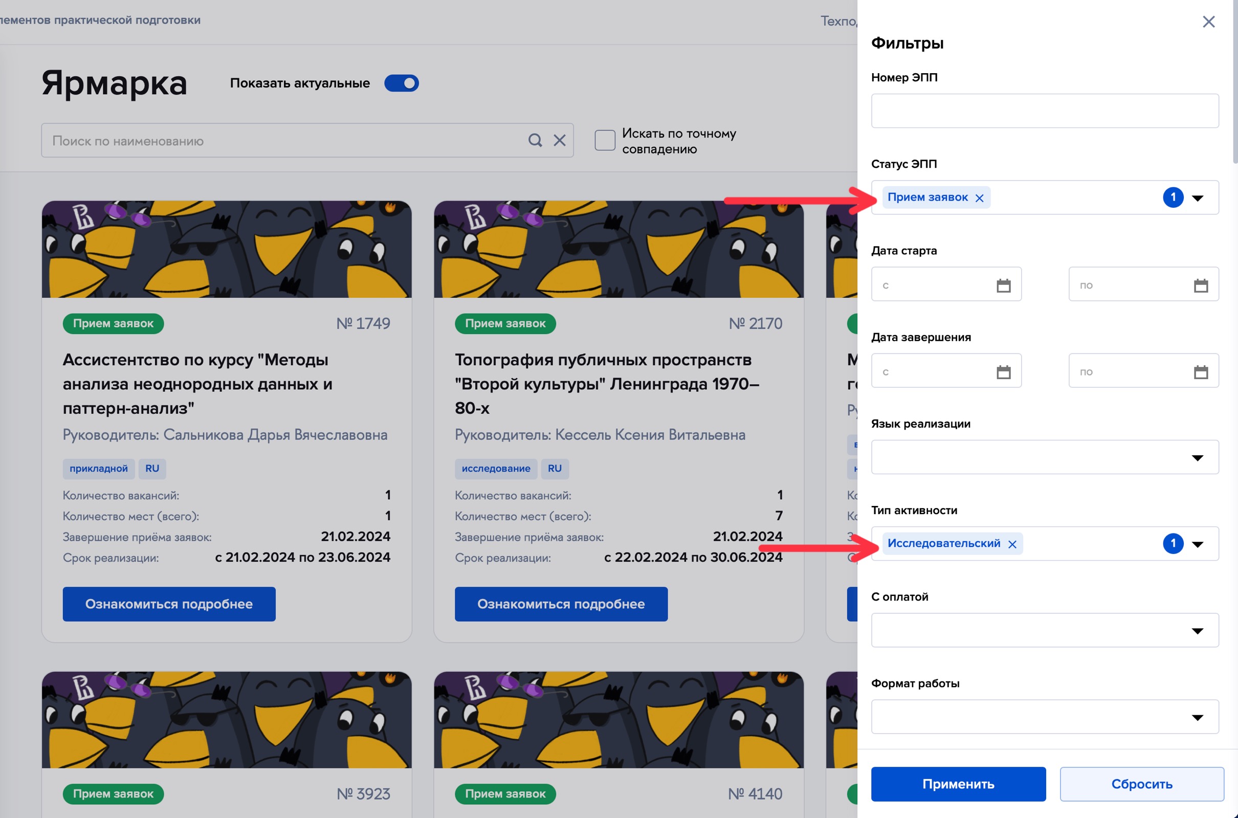 Для выбора проекта подходящего типа (исследовательского или прикладного) студенту нужно зайти на Ярмарку проектов SmartPro и отфильтровать проекты минимум по двум позициям: Статус (прием заявок) и Тип активности (исследовательский или прикладной).
