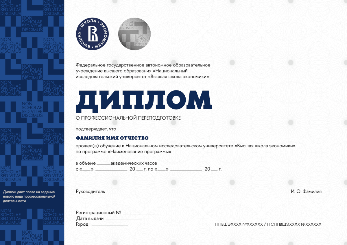 После успешного освоения программы и успешной защиты итоговой аттестационной работы слушатель получает Диплом НИУ ВШЭ установленного образца о профессиональной переподготовке.