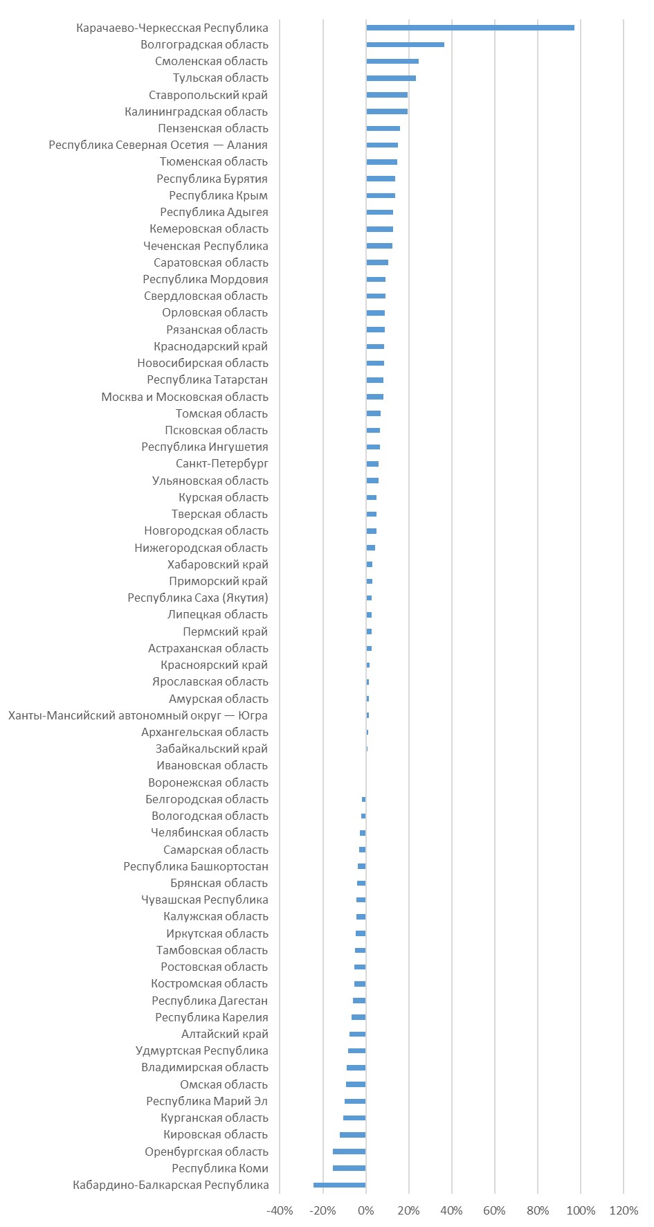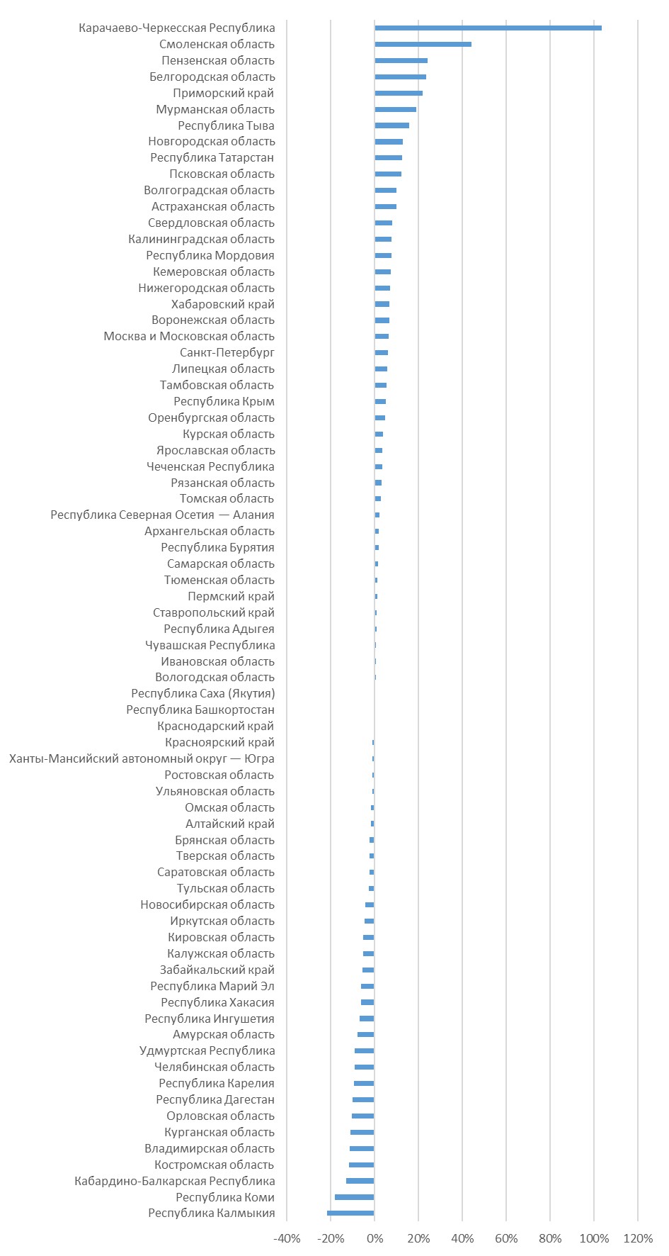 В то же время в 32 регионах зафиксировано снижение бюджетного приема. Наиболее значительное падение наблюдается в Республике Калмыкия (−21,7%), Республике Коми (−18,2%).