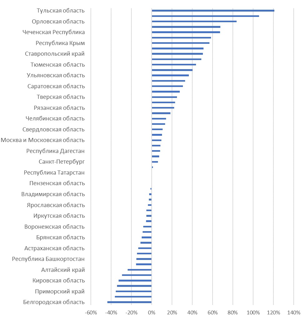 Наибольший прирост отмечен в Саратовской области (на 10,6%), Свердловской области (на 9,1%). Однако в двух регионах зафиксировано снижение численности приема: в Ростовской области (−5,4%) и Самарской области (−3,2%).