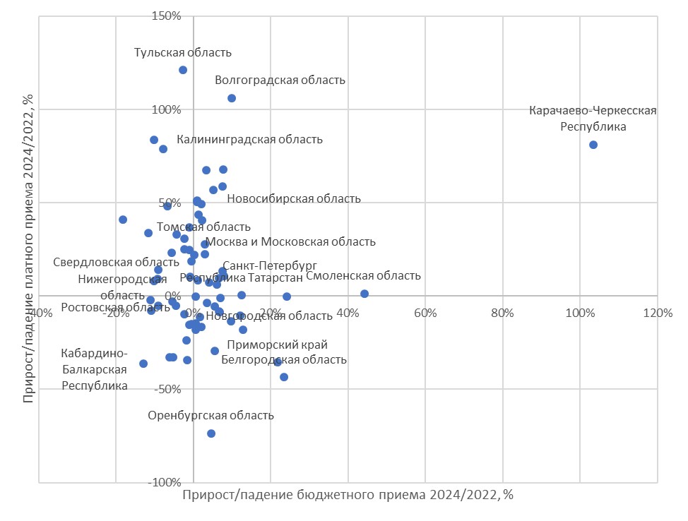 Среди 70 регионов с набором более 1000 студентов в 2024 году большинство − 46 регионов (65,7%) − показали рост общего числа зачисленных. Наибольший прирост отмечен в Карачаево-Черкесской Республике (на 97,3%), Волгоградской (на 36,5%), Смоленской (на 24,5%) и Тульской (на 23,2%) областях. Особенно заметен рост в регионах Центрального федерального округа, где увеличение приема зафиксировано в 11 субъектах. В то же время в 24 регионах (34,3%) наблюдается снижение числа зачисленных. Наиболее значительное сокращение произошло в Кабардино-Балкарской Республике (−24,5%), Республике Коми (−15,5%) и Оренбургской области (−15,4%). Среди территорий, где сократился прием, есть крупные университетские центры, такие как уже упомянутые Ростовская (−5,4%) и Самарская (−3,2%) области, а также Республика Башкортостан (−3,6%) и Челябинская область (−2,7%), где число зачисленных превышает 9 тысяч студентов. Снижение числа абитуриентов преимущественно затронуло регионы Приволжского и – вновь − Центрального федеральных округов (7 и 6 субъектов соответственно). При этом в Центральном федеральном округе в 11 субъектах прием вырос, а в 6 – упал, что говорит о перераспределении студентов внутри федерального округа.