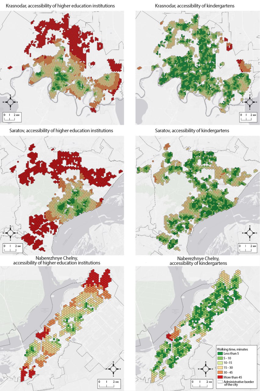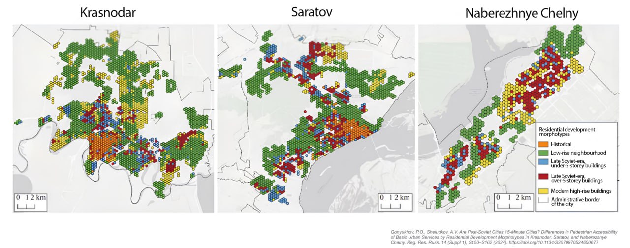 Researchers at HSE University and the RAS Institute of Geography studied the accessibility of essential services in three major Russian cities: Krasnodar, Saratov, and Naberezhnye Chelny. These cities clearly demonstrate the diversity of urban environments, each with its own characteristics: the historically established centre in Saratov, the extensive private housing sector in Krasnodar, the Soviet-era microdistricts in Naberezhnye Chelny, and the ongoing development of modern high-rise apartment buildings in all three cities.