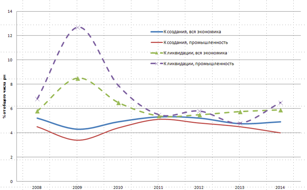 Рис.4: Создание и ликвидация рабочих мест, действующие предприятия, 2008-2014 гг.
