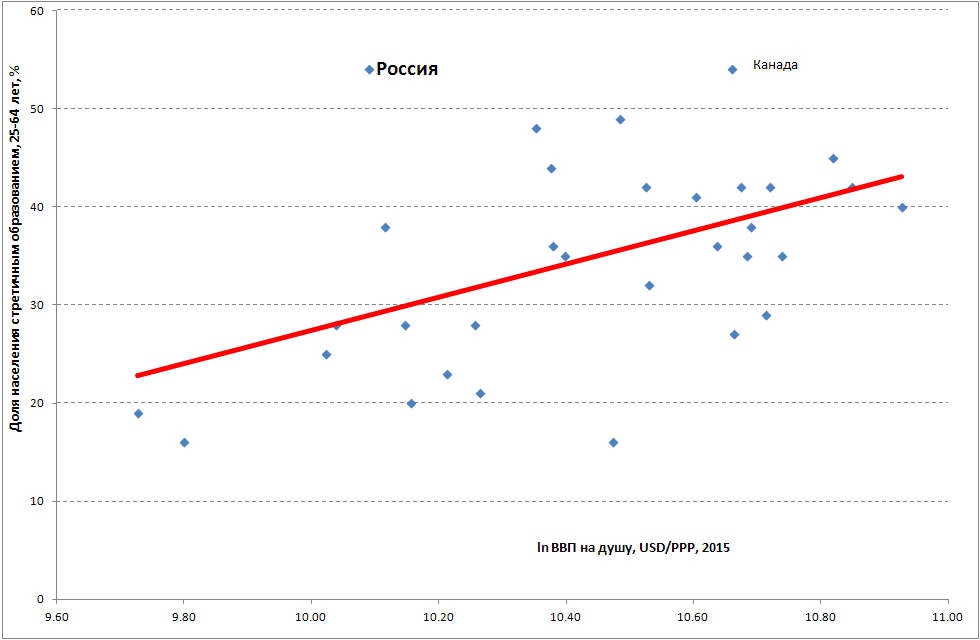 Мы видим, что Россия является одним из лидеров по доле лиц с третичным образованием, то есть по обладанию человеческим капиталом. И, казалось бы, есть прямая связь между человеческим капиталом и ВВП на душу населения, то есть уровнем благосостояния, благополучия страны. Россия здесь является аутсайдером. Мы лидеры в обладании человеческим капиталом (по крайней мере, его определенными формами), но мы аутсайдеры в том, как его используем.