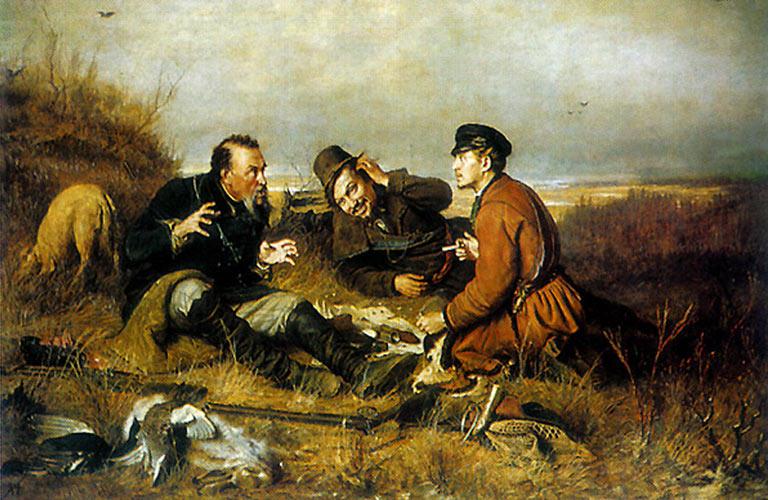 Муж и жена Кувшинниковы страстно увлекались охотой. Женский персонаж Перов вводить в картину не стал, но все три участника сценки имеют реальные прототипы: крайний слева, рассказчик — Д.П. Кувшинников, в центре — его друг доктор В.В. Бессонов, справа — тоже доктор, молодой Н.М. Нагорнов.