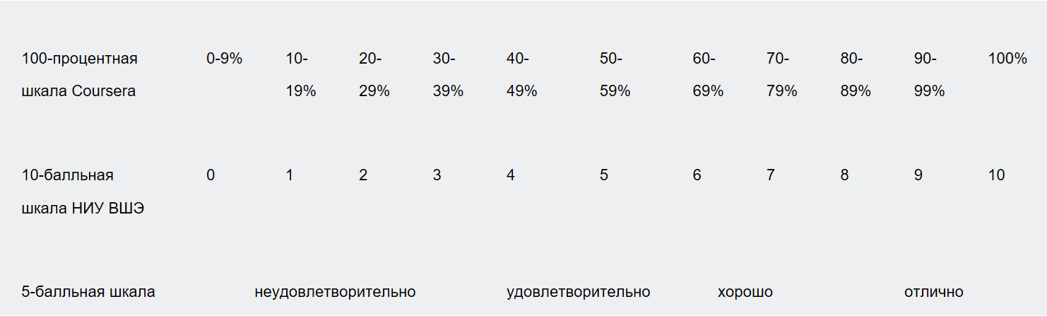 Шкала соответствия процентов на платформе Coursera с баллами НИУ ВШЭ: