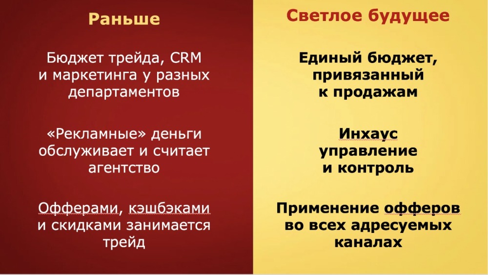 Всё это ведёт к революционным изменениям в том, как будет управляться маркетинг крупнейших FMCG брендов. Трейд-маркетинговый и рекламный бюджеты смогут действовать вместе. Потребуются новые специалисты, которые освоят эти технологии. Для этого необходимо будет совмещать умения аналитика, маркетолога и менеджера продукта или бренд-менеджера.