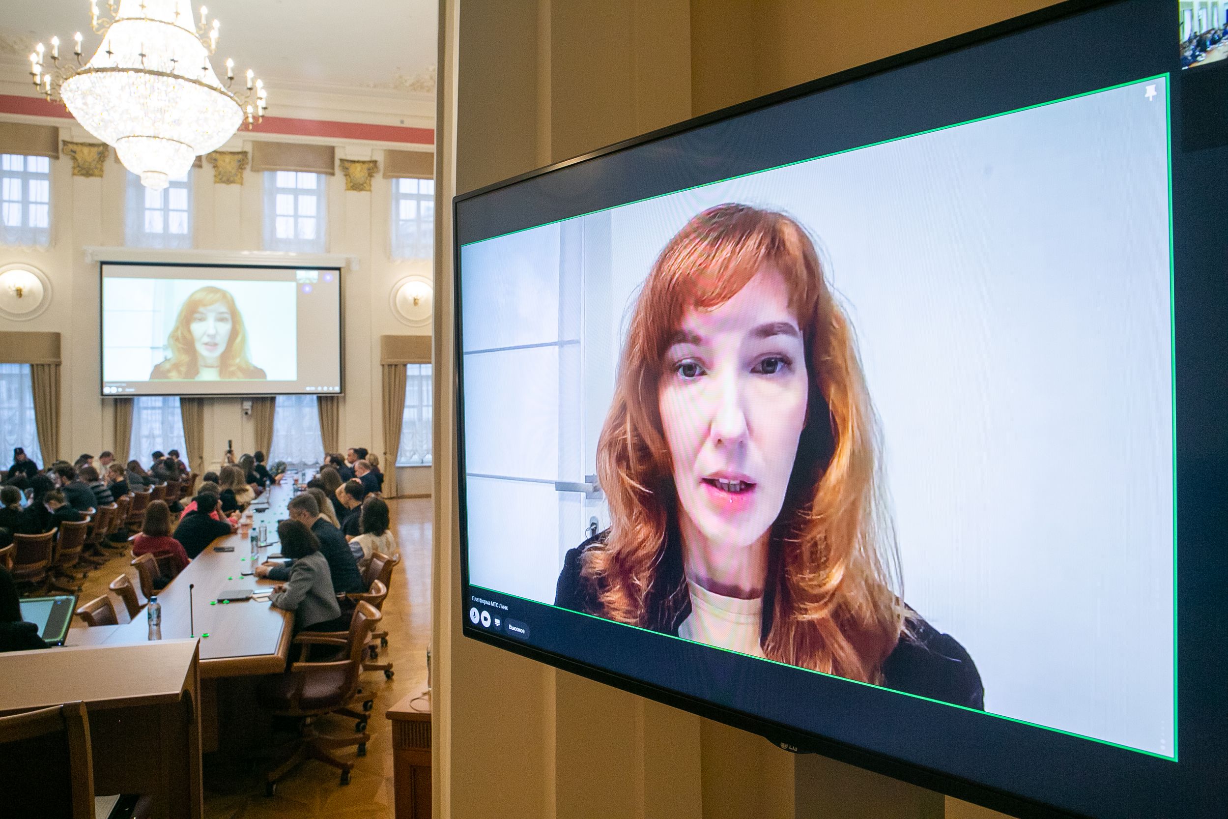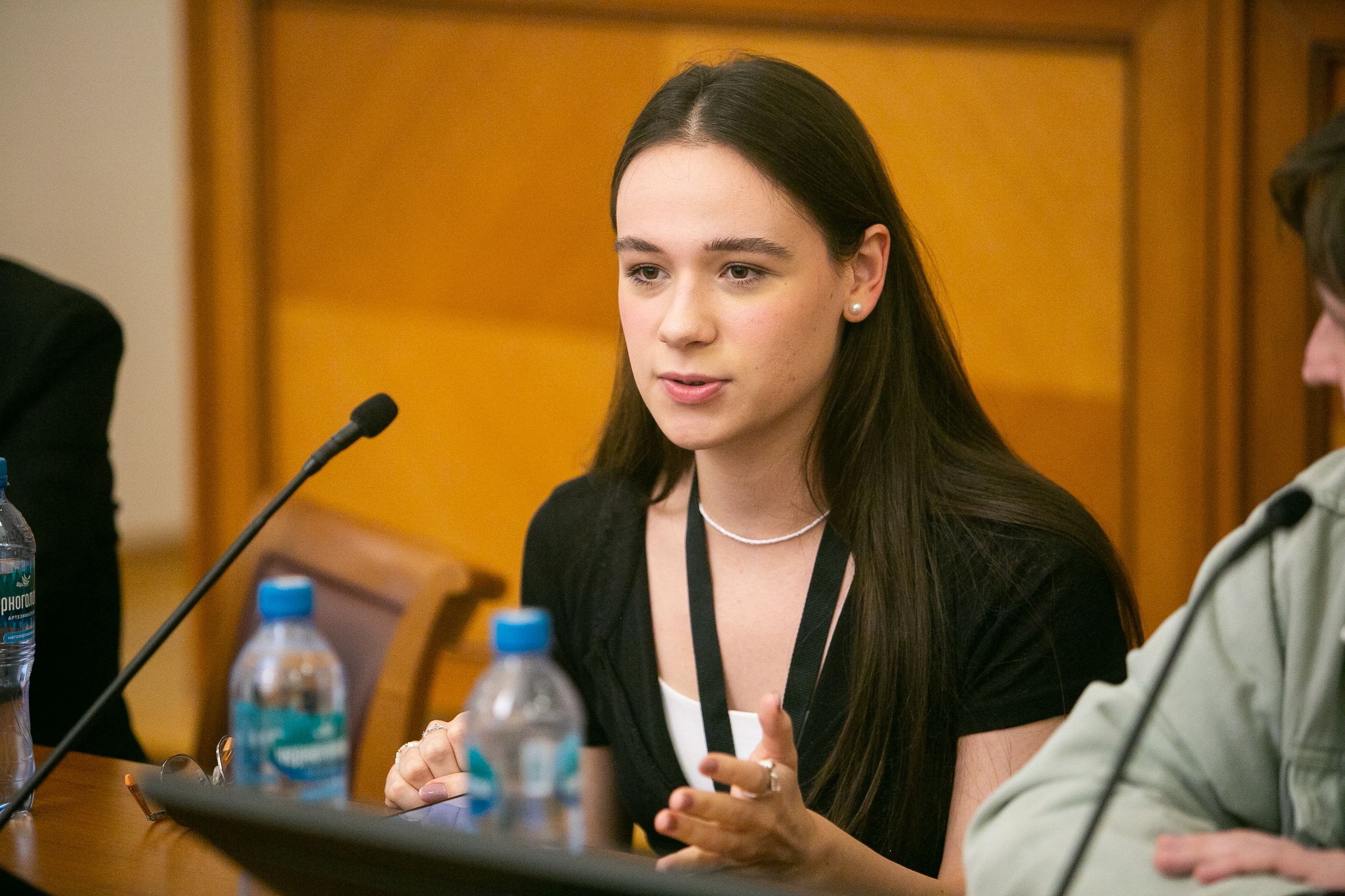 Студенческую аудиторию представляла Николь Джугели — студентка образовательной программы «Иностранные языки и межкультурная коммуникация» НИУ ВШЭ. Она поделилась собственным опытом применения ИИ в образовательном процессе как с позиции обучающегося, так и с позиции репетитора: «Помогает экономить время, и ученики довольны». По ее мнению, было бы полезно, если бы студентов, чья специальность не связана с IT, в университете обучали конкретным технологиям ИИ, как сейчас обучают программированию на Python.
