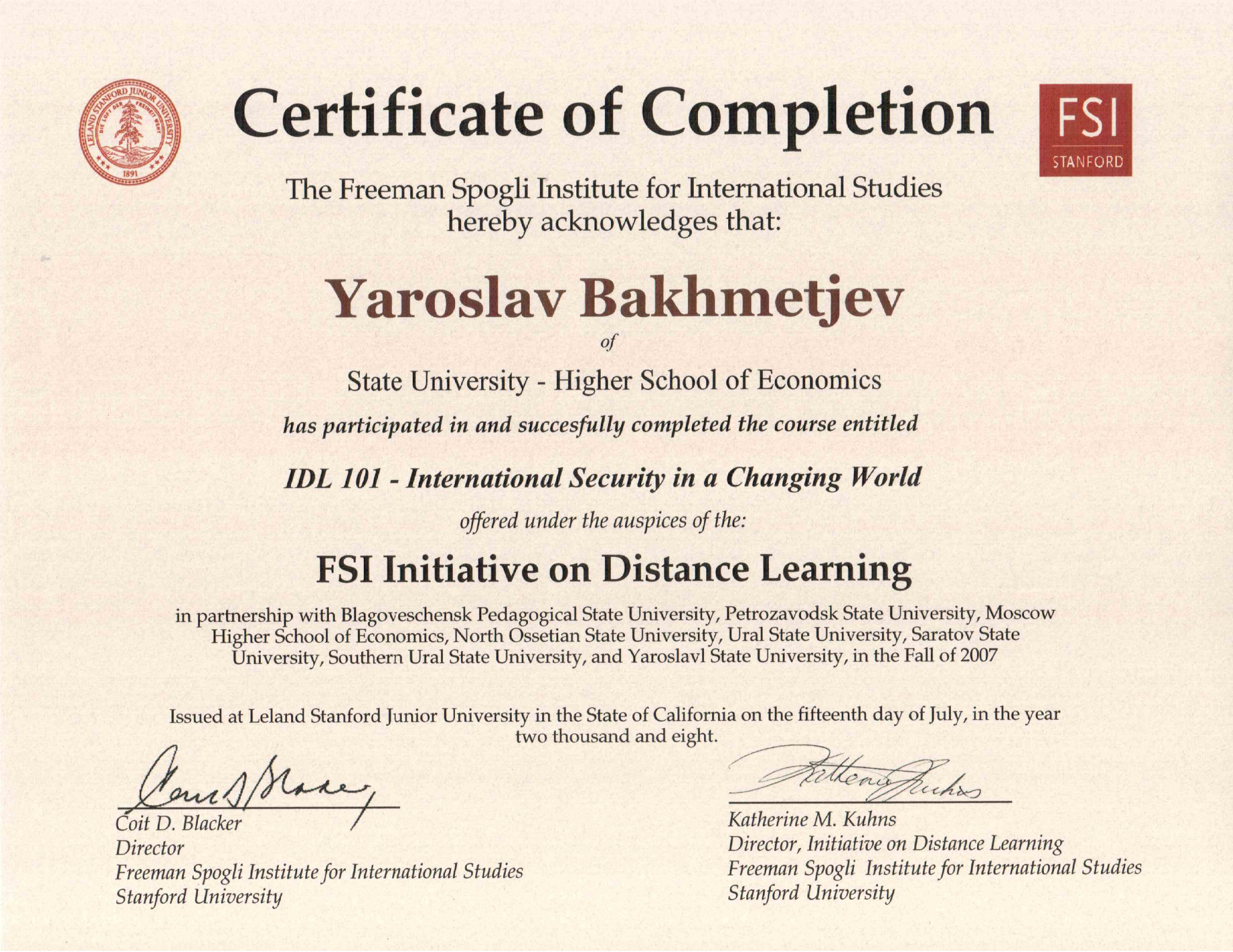 - 2007 Stanford University, Freeman Spogli Institute for International Studies, Международная программа дистанционного обучения: IDL-101 “International security in a changing world”. Имеется сертификат