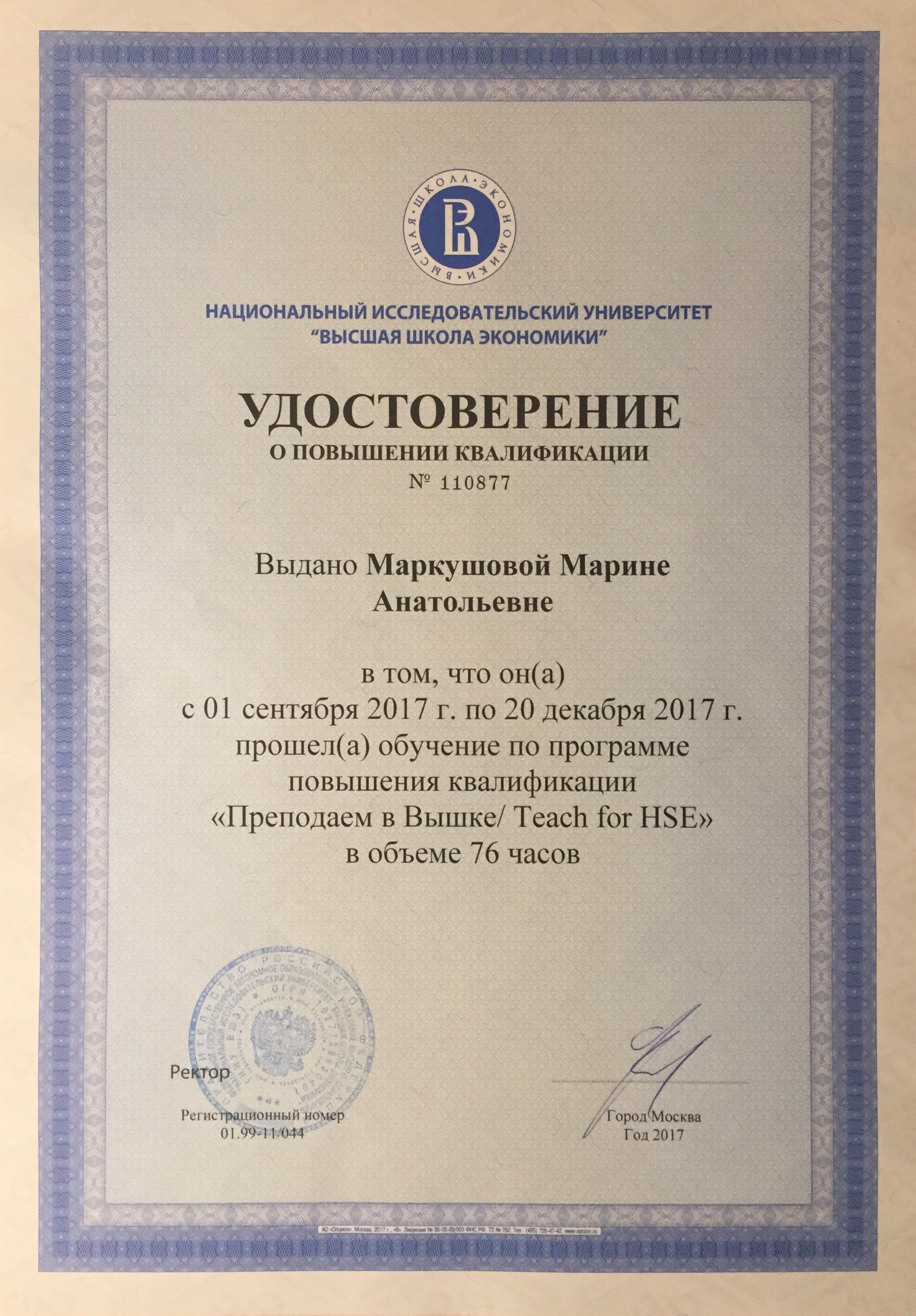 2017 – "Преподаем в Вышке/Teach for HSE", программа повышения квалификации, НИУ ВШЭ (76 ак. ч)