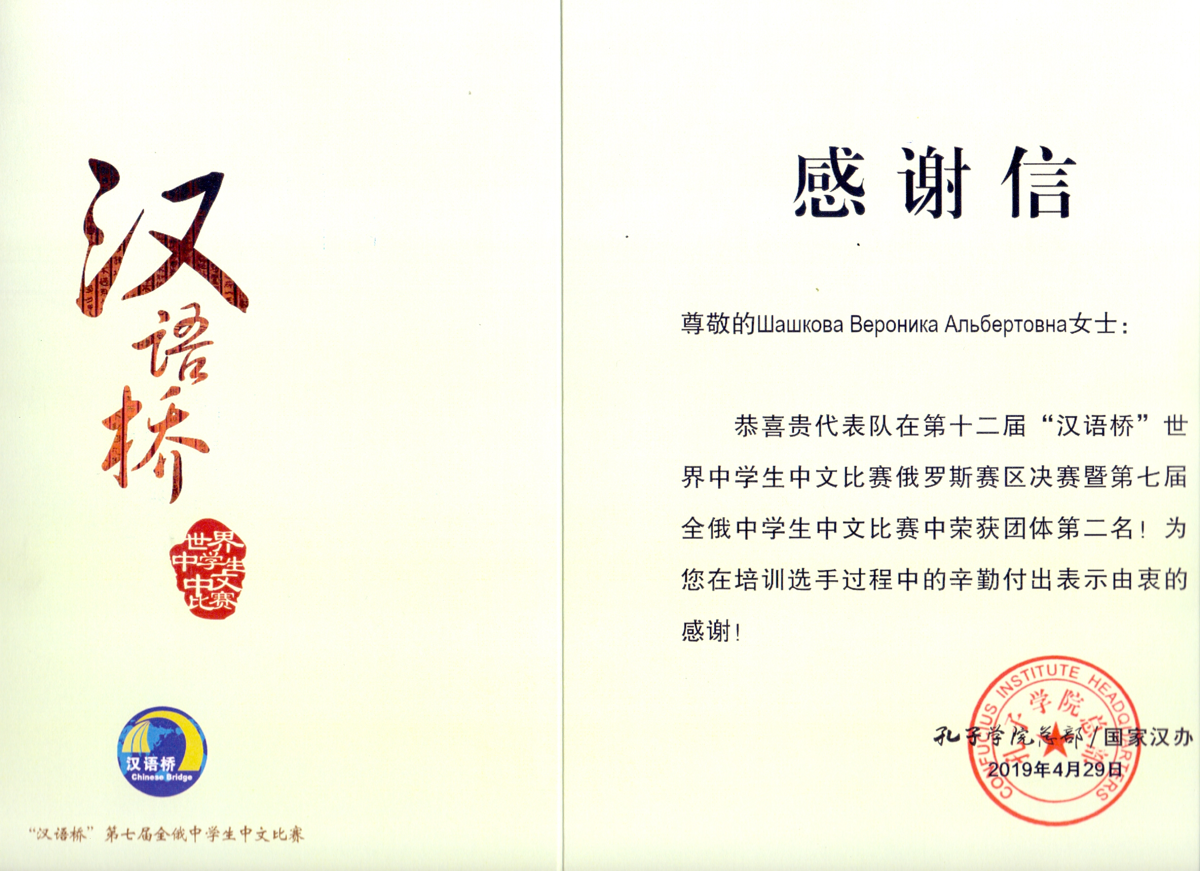 Благодарность от Всемирного конкурса китайского языка "Мост китайского языка" среди школьников.