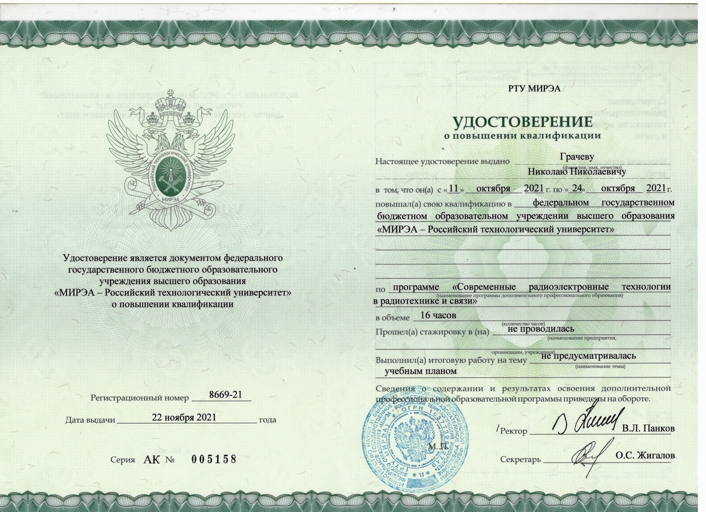 2021 г. "Современные радиоэлектронные технологии в радиотехнике и связи". Федеральное государственное бюджетное образовательное учреждение высшего образования "МИРЭА - Российский технологический университет". Удостоверение о повышении квалификации 16 часов. /mirror/pubs/share/560076020