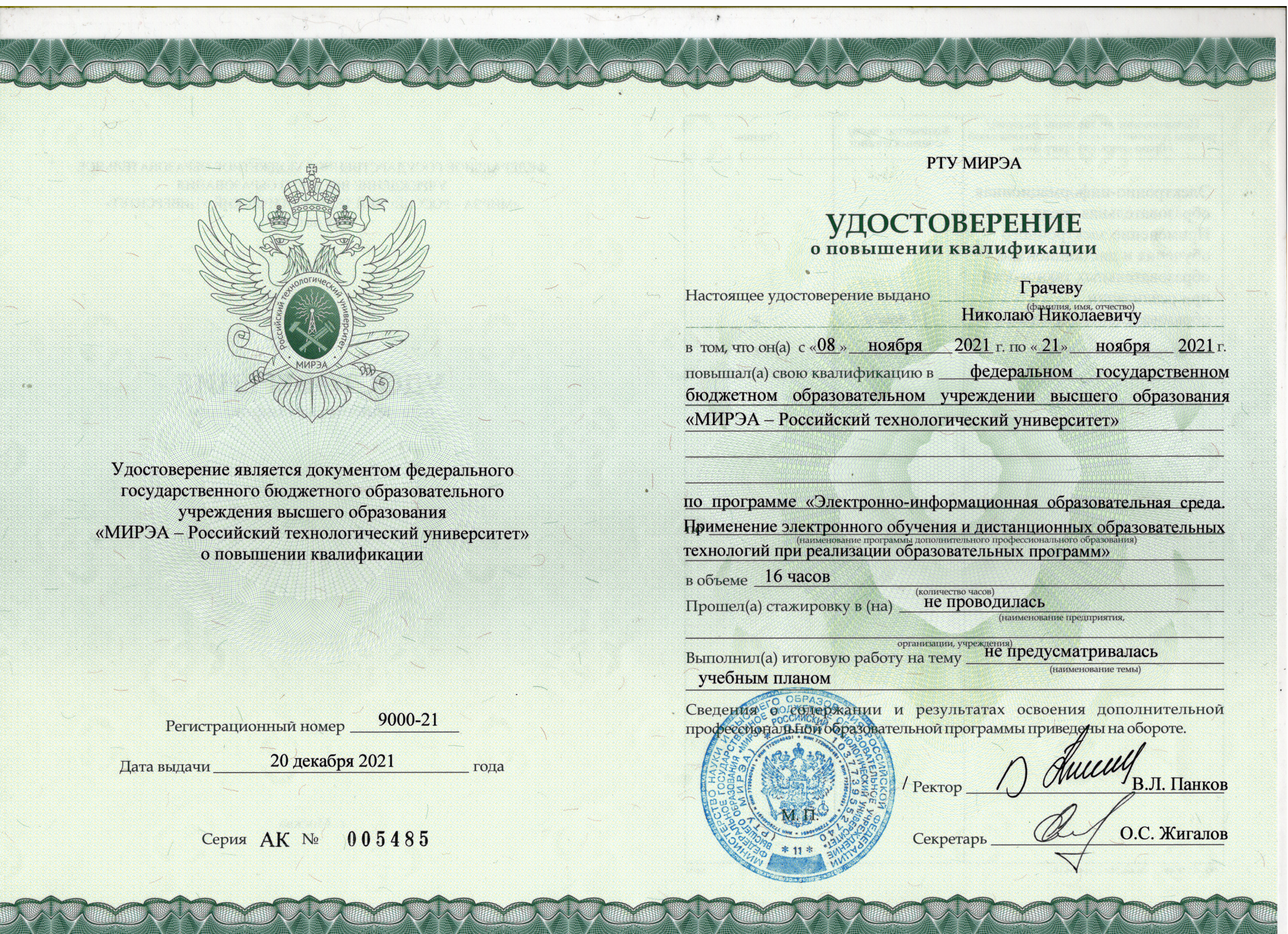 2021 г. "Электронно-информационная образовательная среда. Применение электронного обучения и дистанционных образовательных технологий при реализации образовательных программ". Федеральное государственное бюджетное образовательное учреждение высшего образования "МИРЭА - Российский технологический университет". Удостоверение о повышении квалификации 16 часов. /mirror/pubs/share/560076077