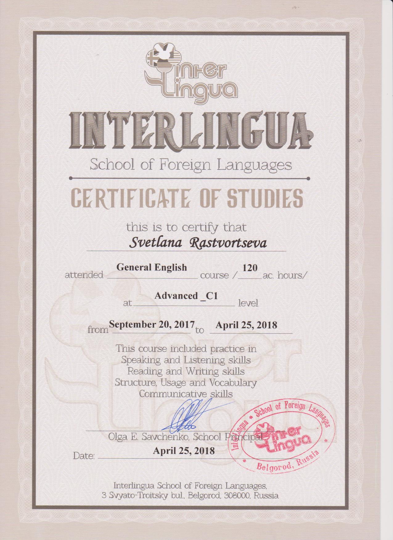 2018 год. General English Course at Advanced_C1 Level (120 ac.hours) by Interlingua-School of Foreign Languages. Sertificate of Studies, April 25, 2018
