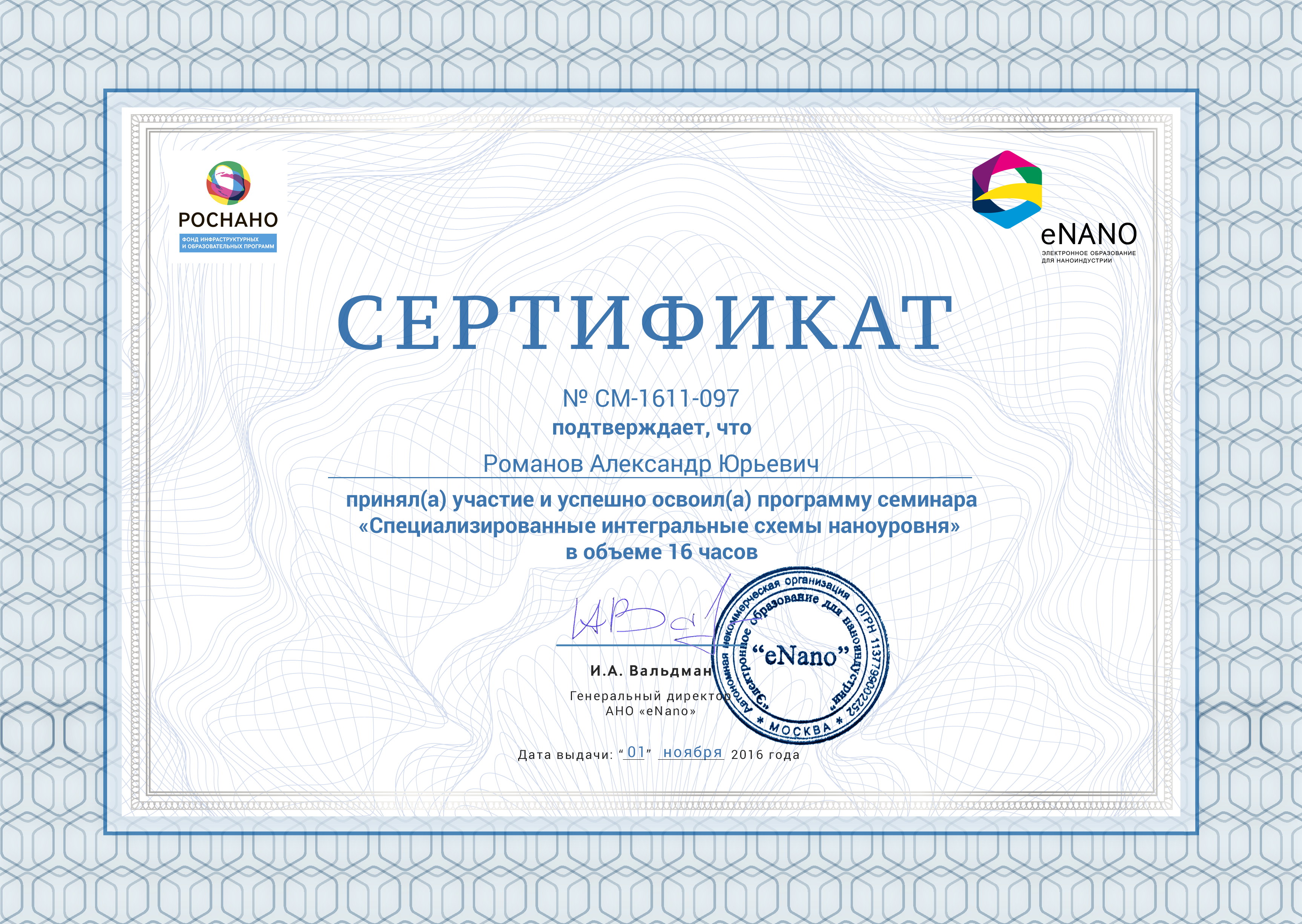 2016 31 октября – 1 ноября (Национальный исследовательский технологический университет «МИСиС», Москва; главный организатор – Фонд инфраструктурных и образовательных программ (ФИОП) РОСНАНО и его дочерней компании eNANO). Семинар «Специализированные интегральные схемы нанонуровня» (объем – 16 часов). Сертификат № СМ-1611-097, выдан 01.11.2016 г.