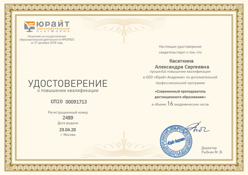 - Повышение квалификации "Современный преподаватель дистанционного образования" в объеме 16 часов (апрель 2020 г.) (ООО "Юрайт-Академия").