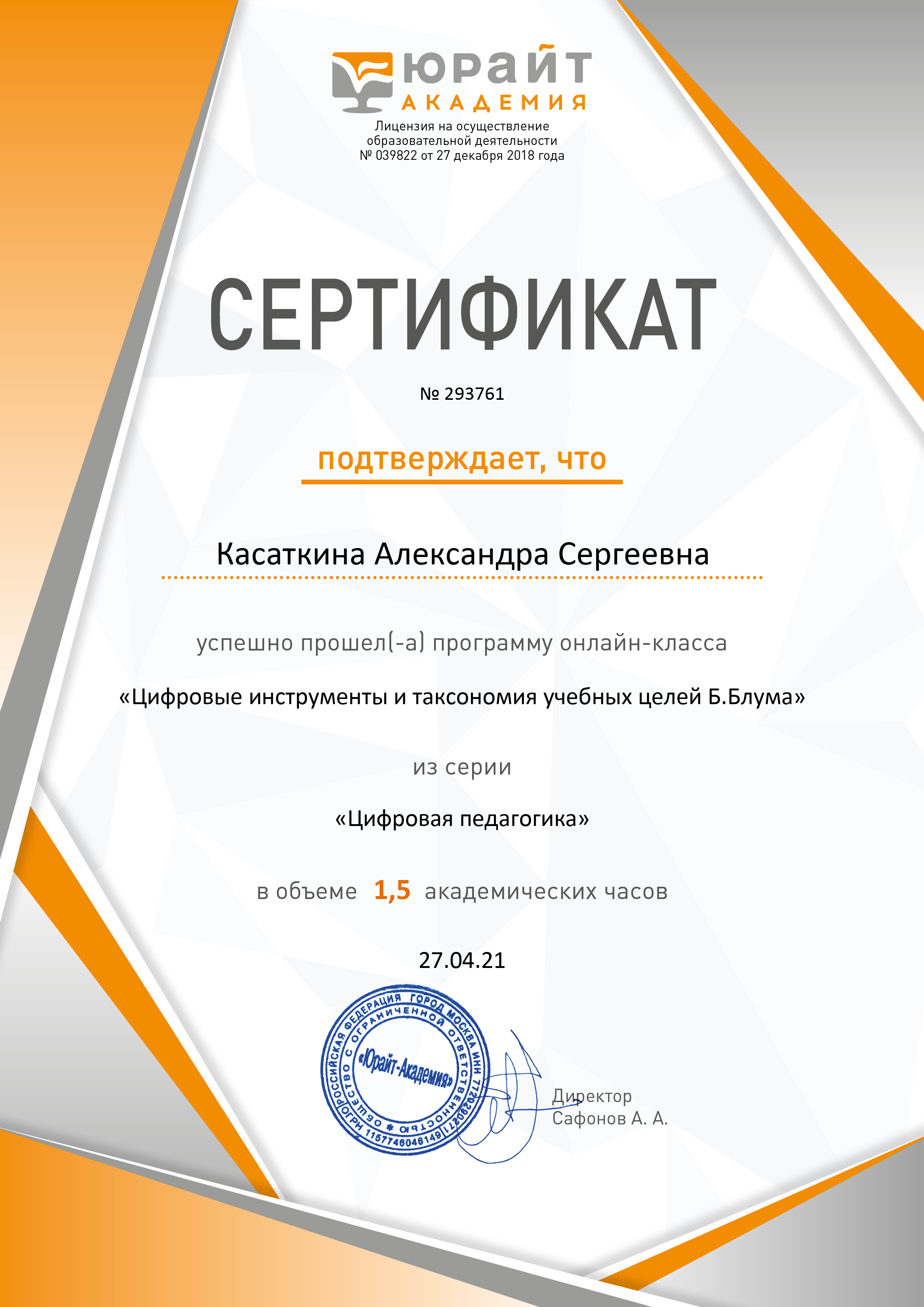 - Участие в работе научно-практического семинара "Цифровые инструменты и таксономия учебных целей Б.Блума" (27 апреля 2021 г., ООО "Юрайт-Академия").