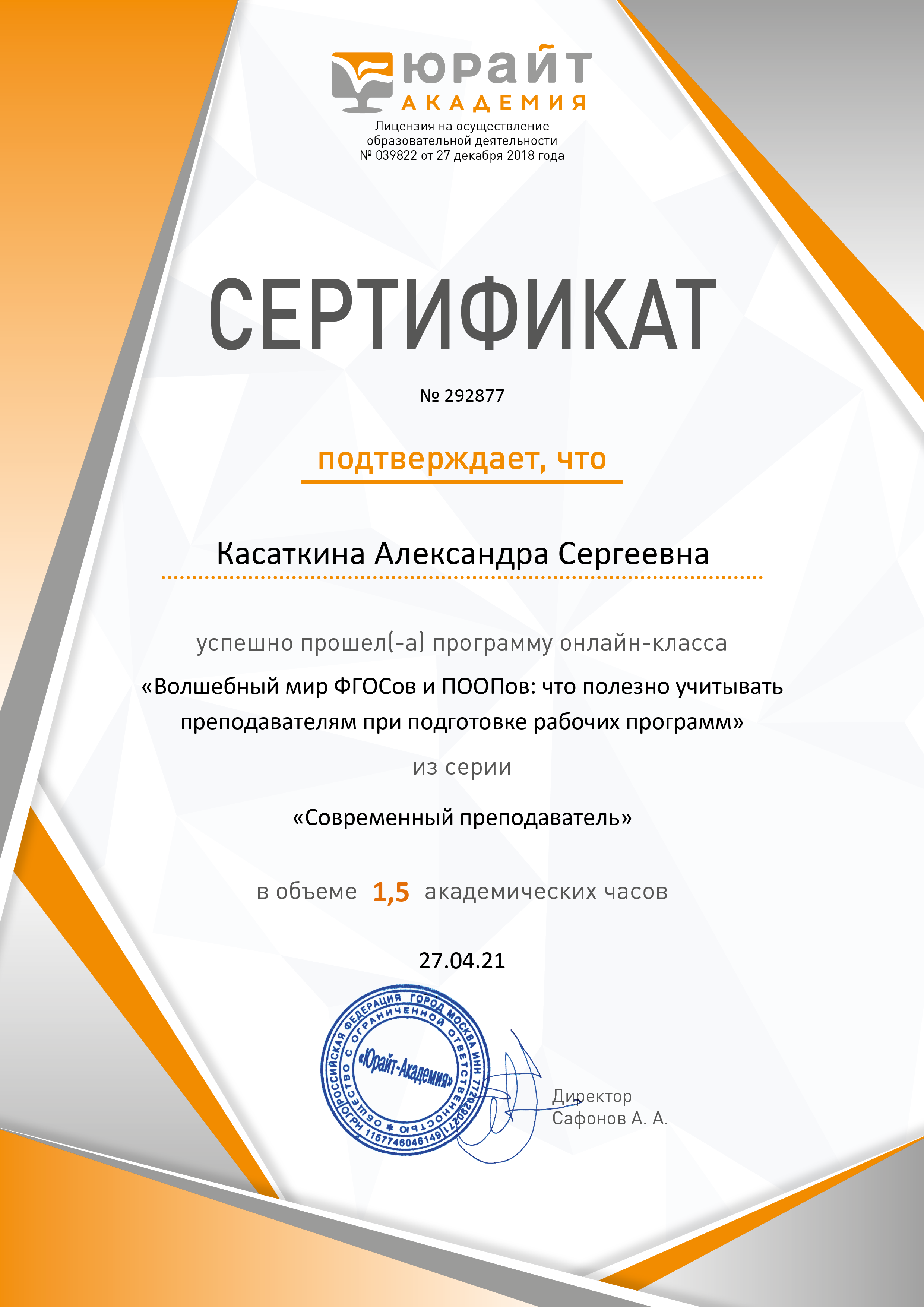 - Участие в работе научно-практического семинара «Волшебный мир ФГОСов и ПООПов: что полезно учитывать преподавателям при подготовке рабочих программ» (27 апреля 2021 г., ООО "Юрайт-Академия").