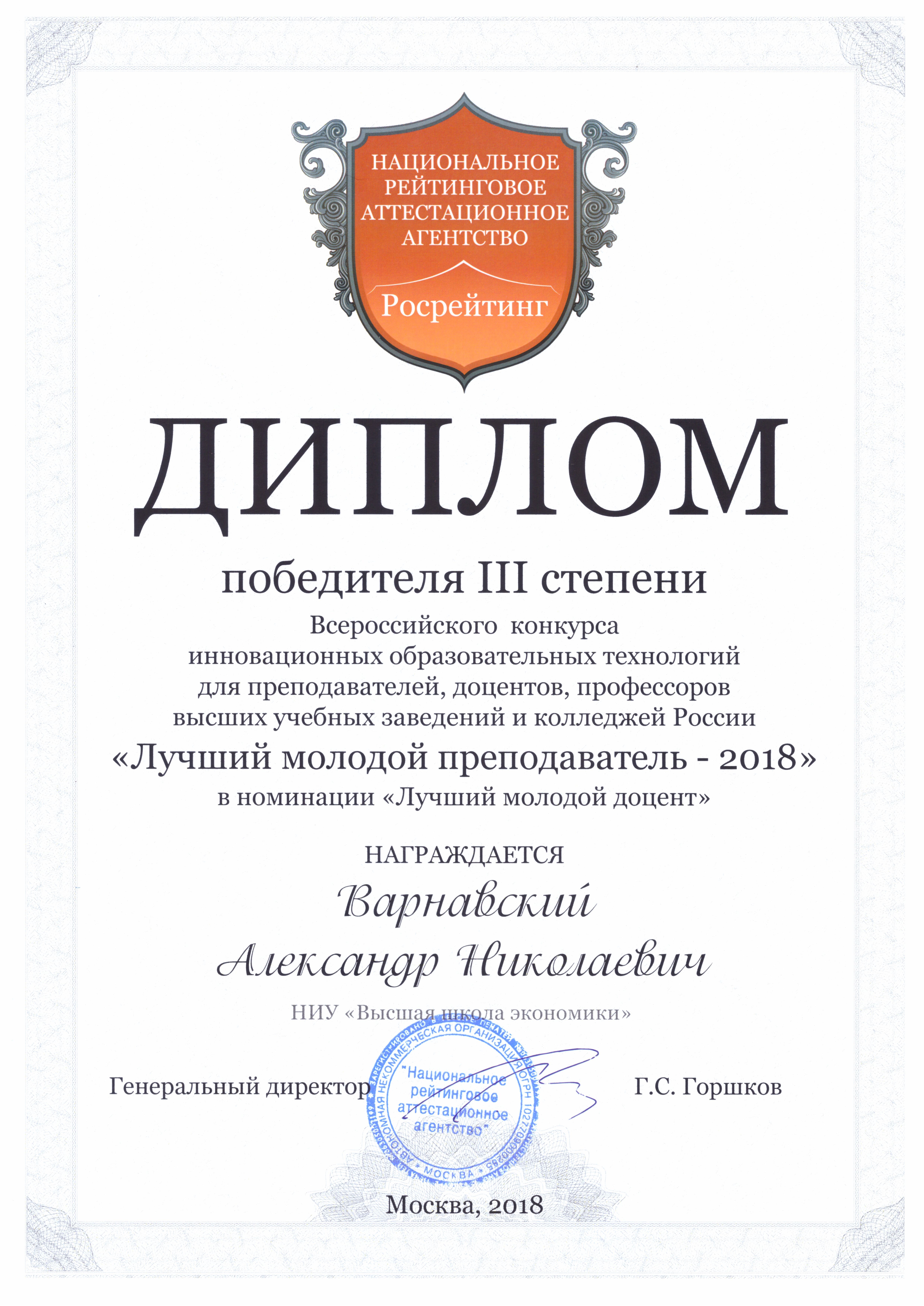 - Победитель Всероссийского конкурса инновационных образовательных технологий "Лучший молодой преподаватель - 2018" в номинации "Лучший молодой доцент" (диплом победителя III степени) (Росрейтинг).
