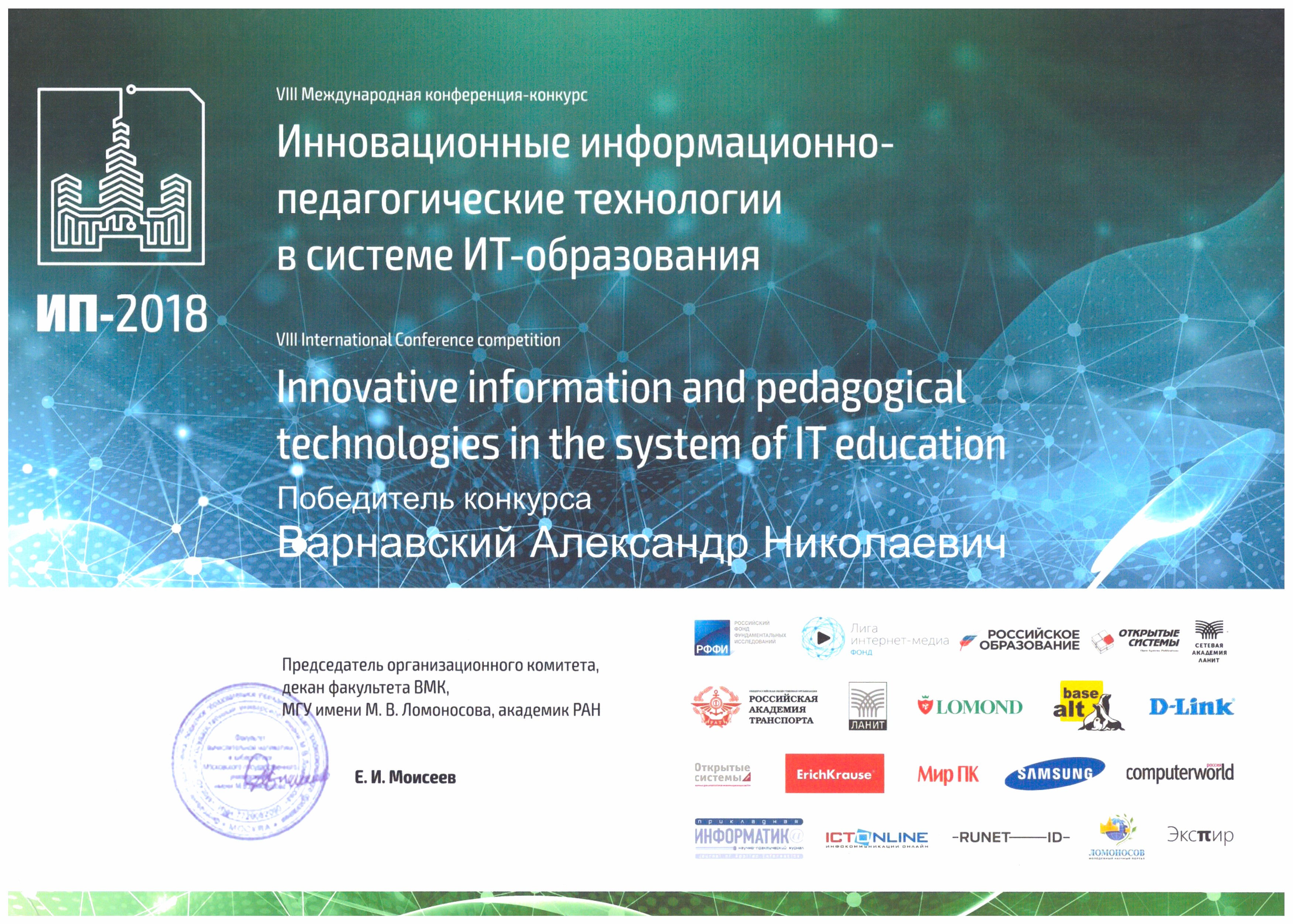 - Победитель VIII Международной конференции-конкурс "Инновационные информационно-педагогические технологии в системе ИТ-образования" (МГУ имени М.В. Ломоносова).