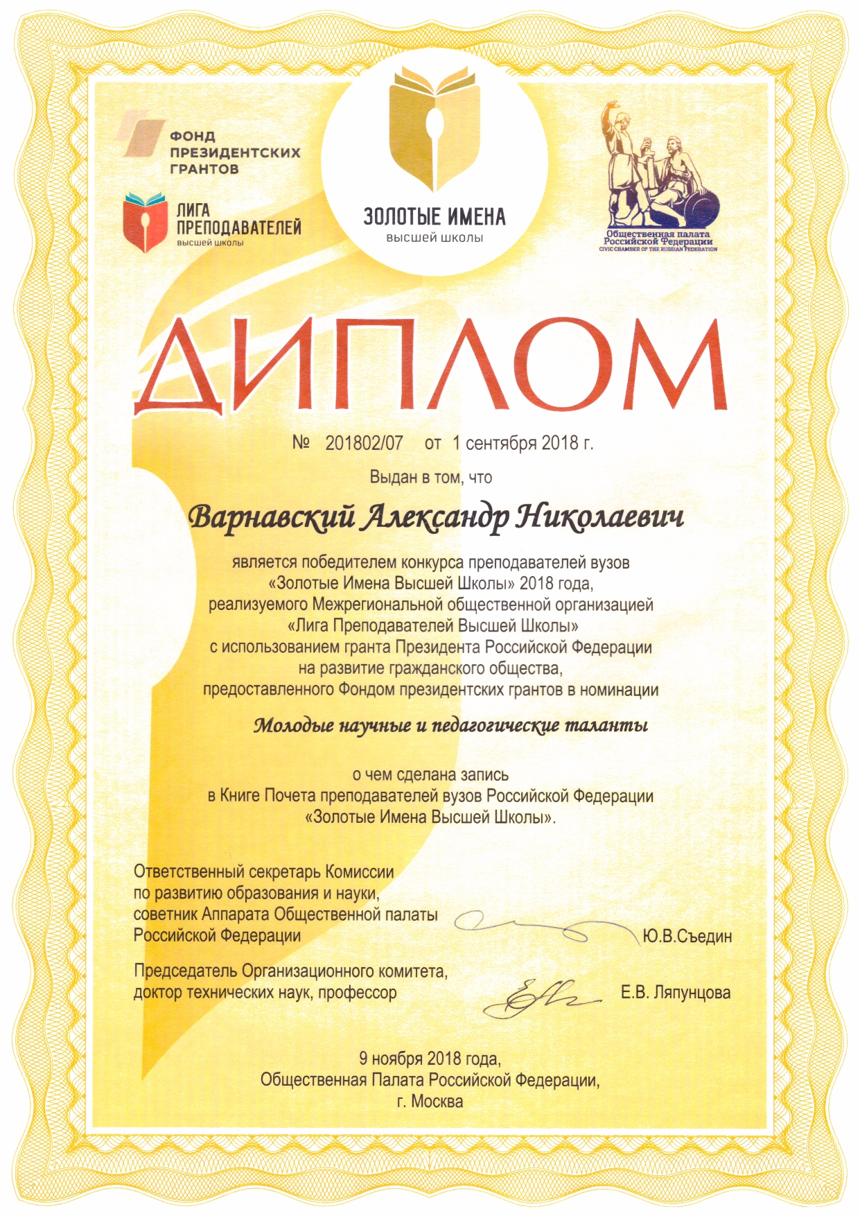 - Победитель конкурса преподавателей вузов "Золотые Имена Высшей Школы" 2018 г. в номинации "Молодые научные и педагогические таланты".