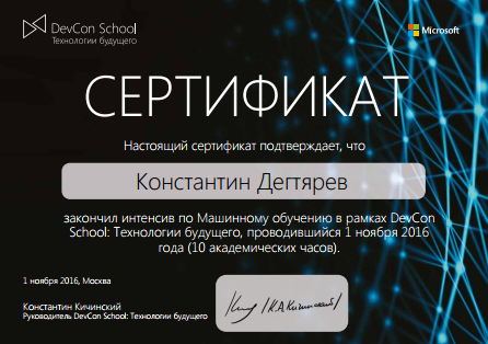 - [ноябрь 2016] DevCon: Технологии будущего - школа Microsoft для разработчиков в России (сертификат)