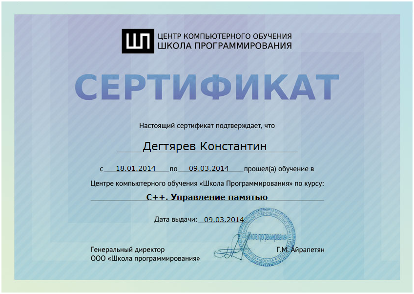 - [январь-март 2014] ЦКО Школа Программирования: С++. Управление памятью (сертификат №12285)