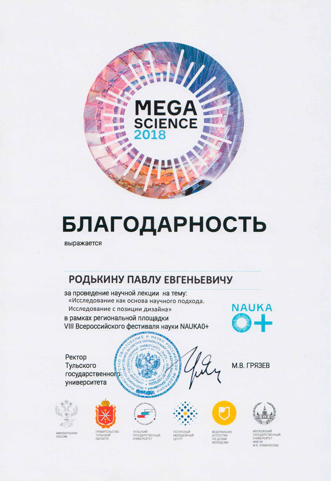 Благодарность за провдение научной лекции в рамках региональной площадки VIII Всероссийского фестиваля науки NAUKA 0+ 2018