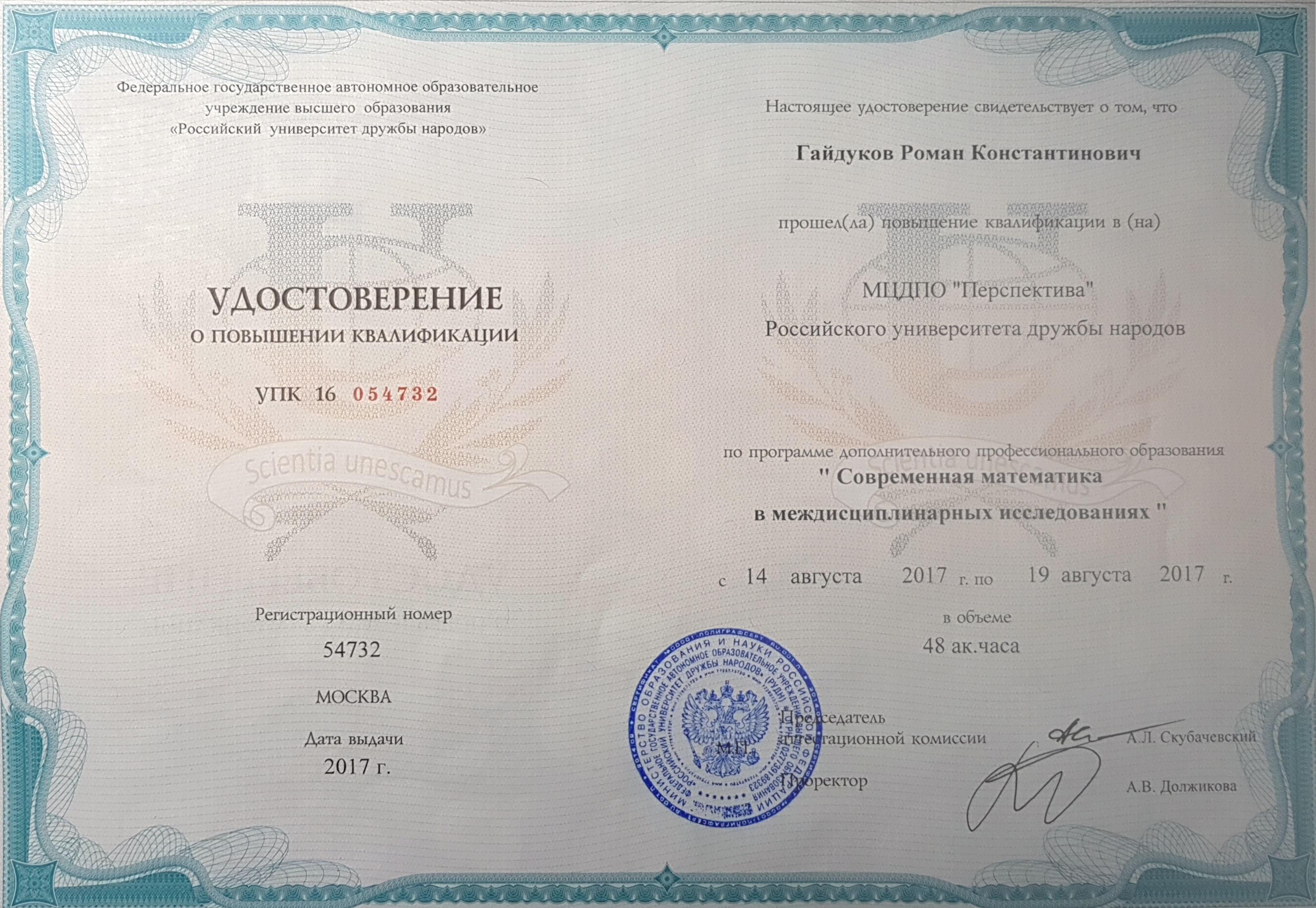 - 2017 МЦДПО "Перспектива" Российского университета дружбы народов. "Современная математика в междисциплинарных исследованиях" в объеме 48. ак. часов. Удостоверение