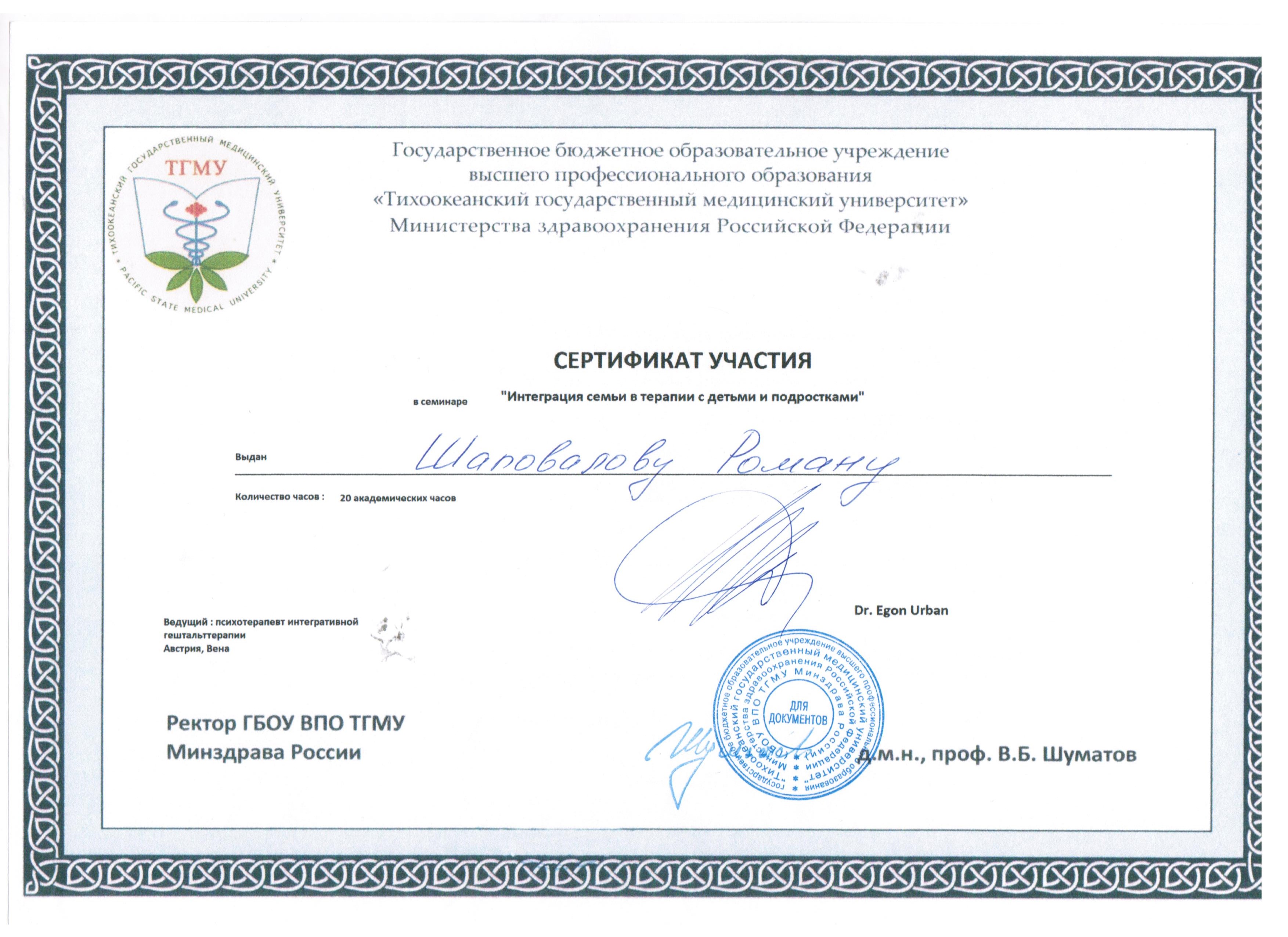 - Семинар "Интеграция семьи в терапии с детьми и подростками", 20 часов, Владивосток, 2014.