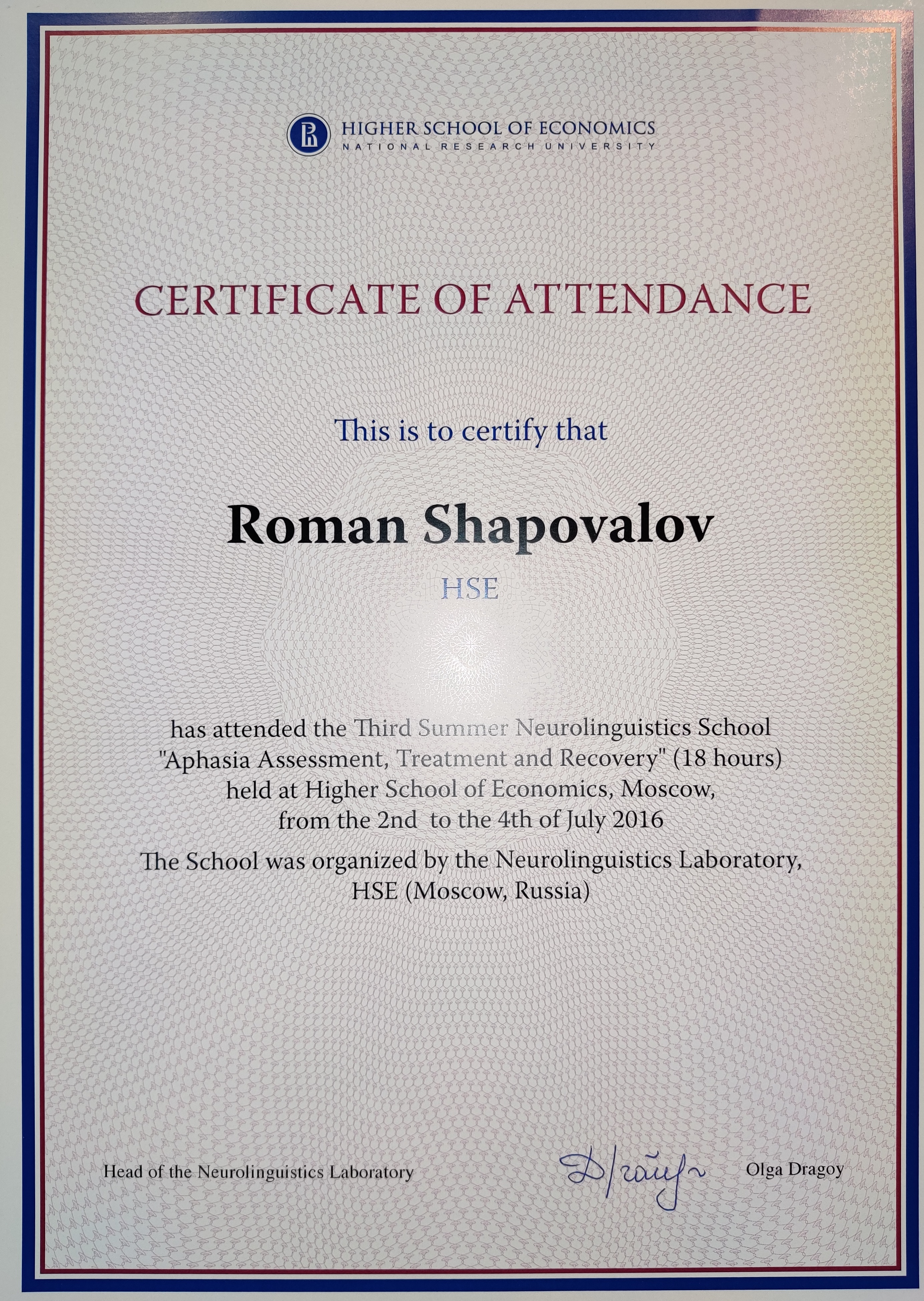 - Летняя нейролингвистическая школа "Aphasia Assessment, Treatment and Recovery", 18 часов, НИУ ВШЭ, Москва, 2016.