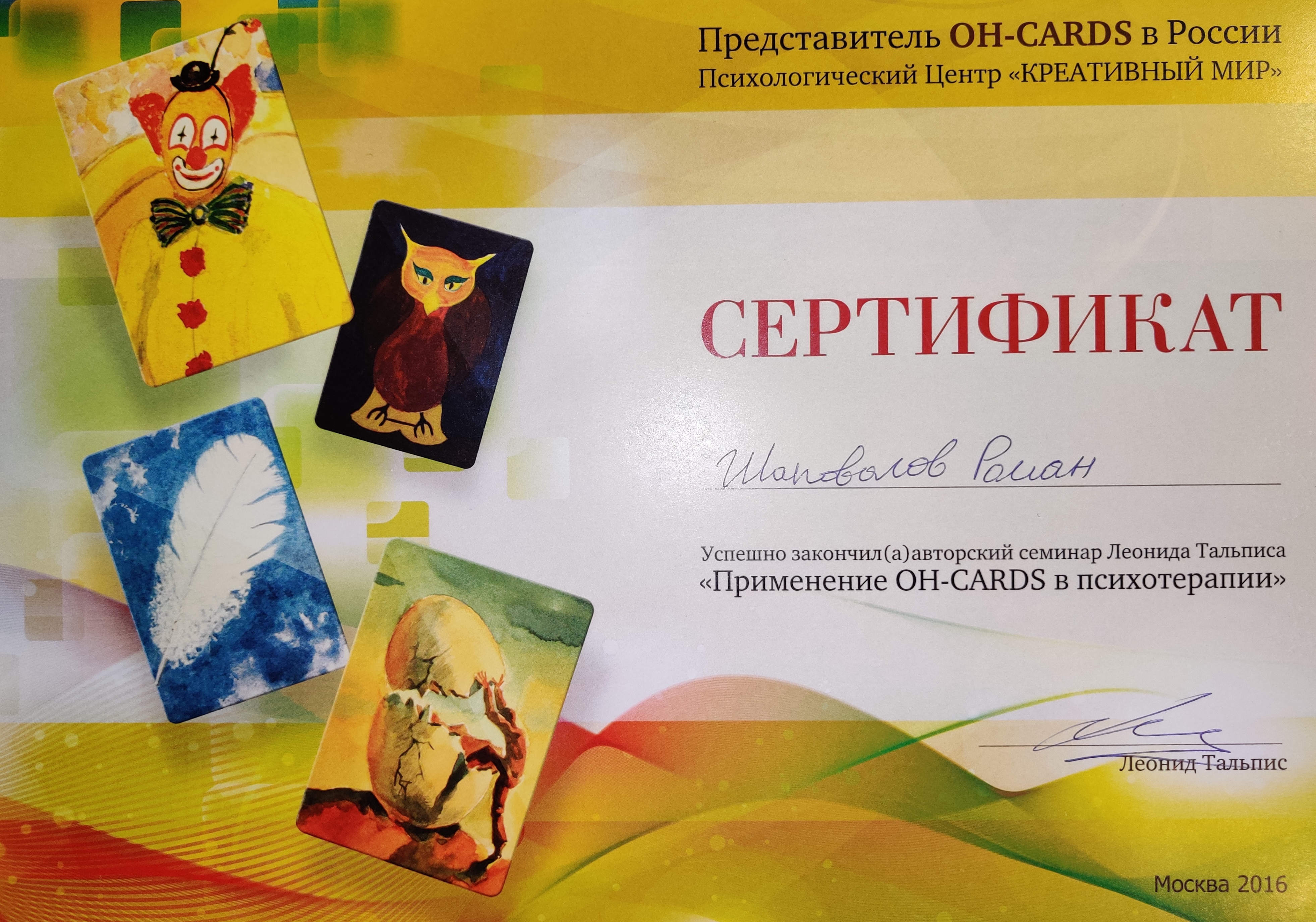 - Авторский семинар Леонида Тальписа "Применение OH-CARDS в психотерапии", Москва, 2016.