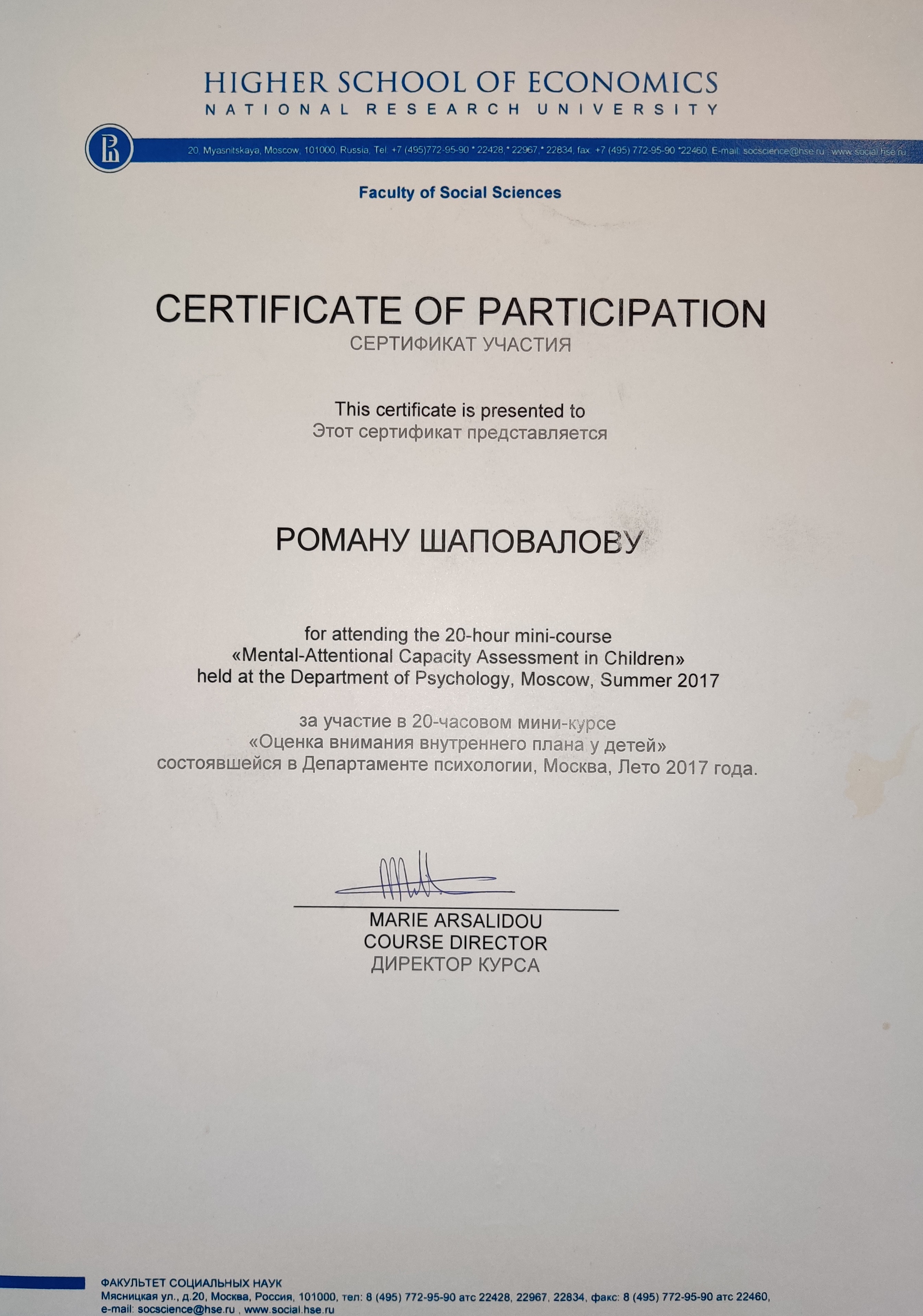 - Мини-курс "Оценка внимания внутреннего плана у детей", 20 часов, Москва, 2017.
