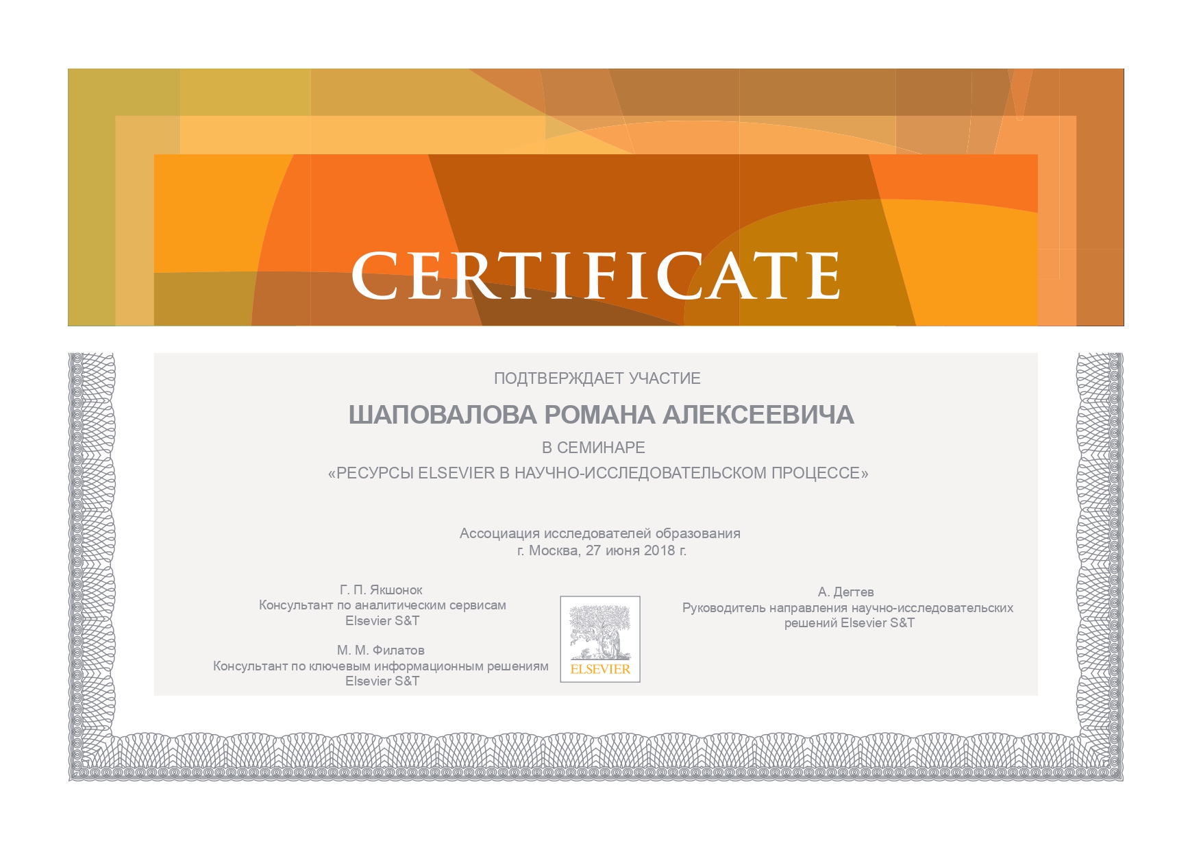 - Семинар "Ресурсы Elsevier в научно-исследовательском процессе", Москва, 2018.