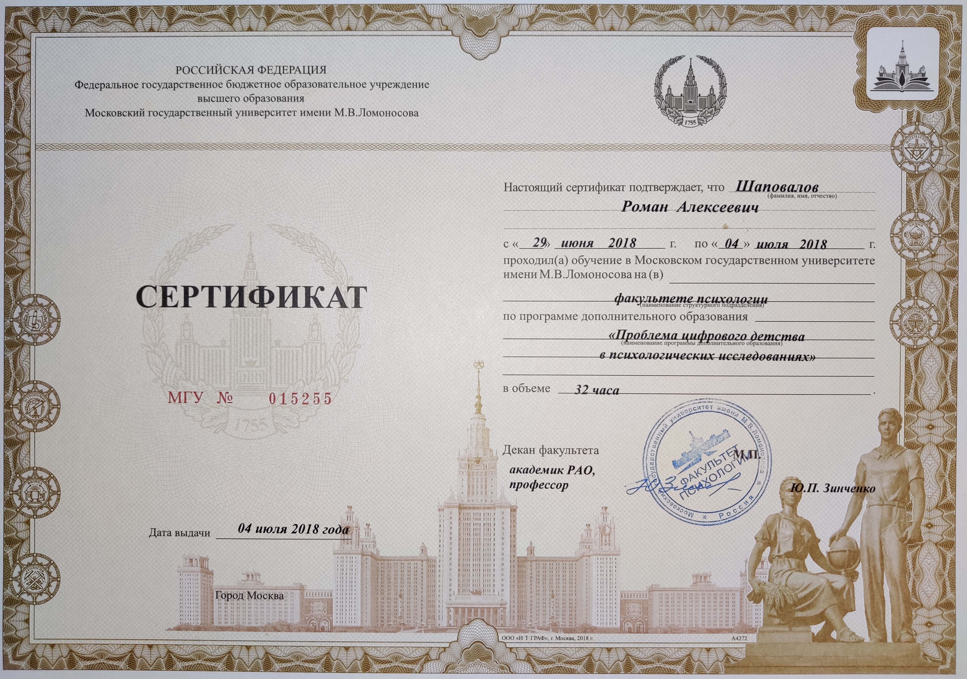 - Программа ДПО в рамках Летней психологической школы "Проблема цифрового детства в психологических исследованиях", 32 часа, МГУ им. М.В. Ломоносова, Москва, 2018.