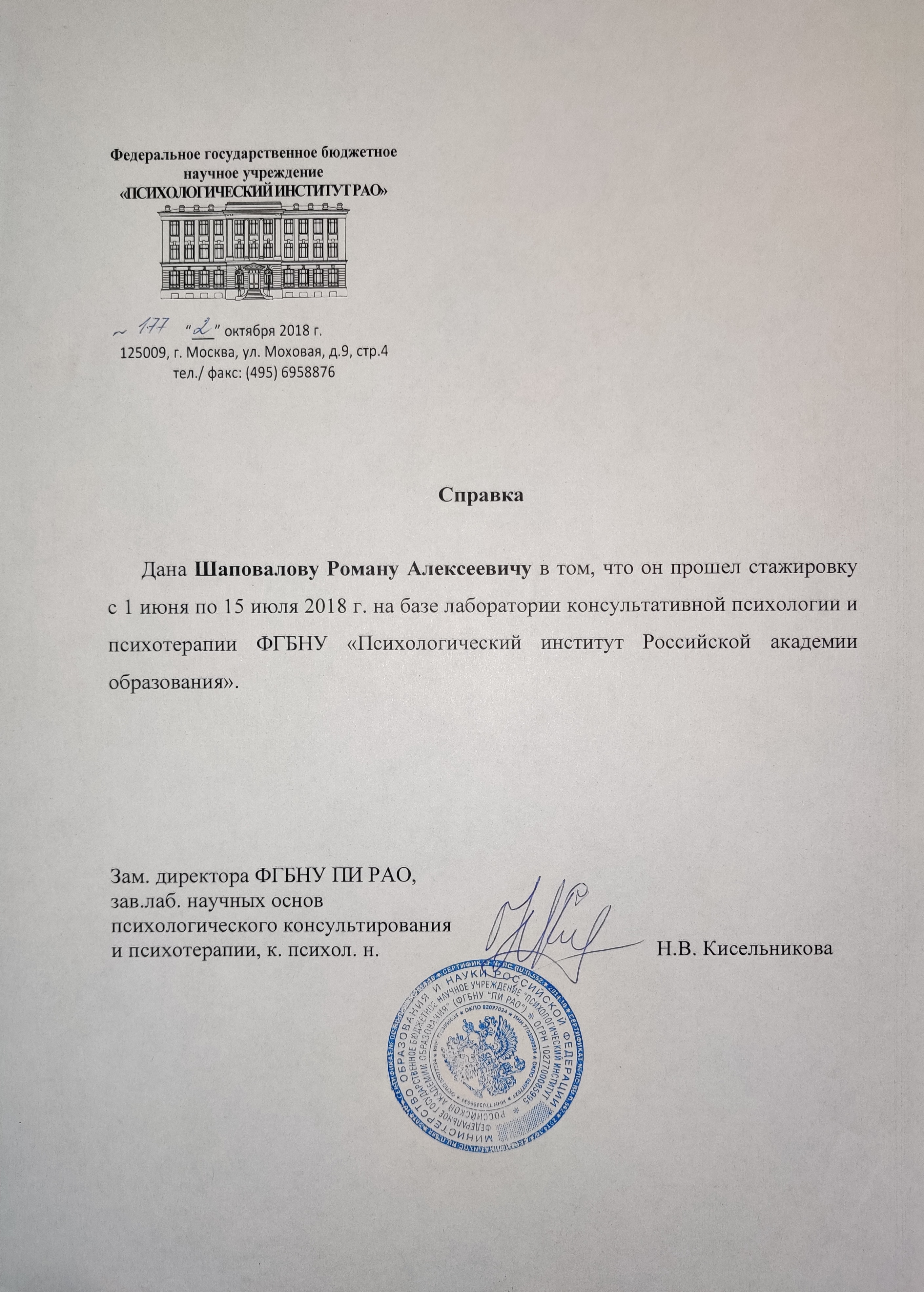 - Повышение квалификации "Интегративная модель помогающих умений", 20 часов, Москва, 2017.