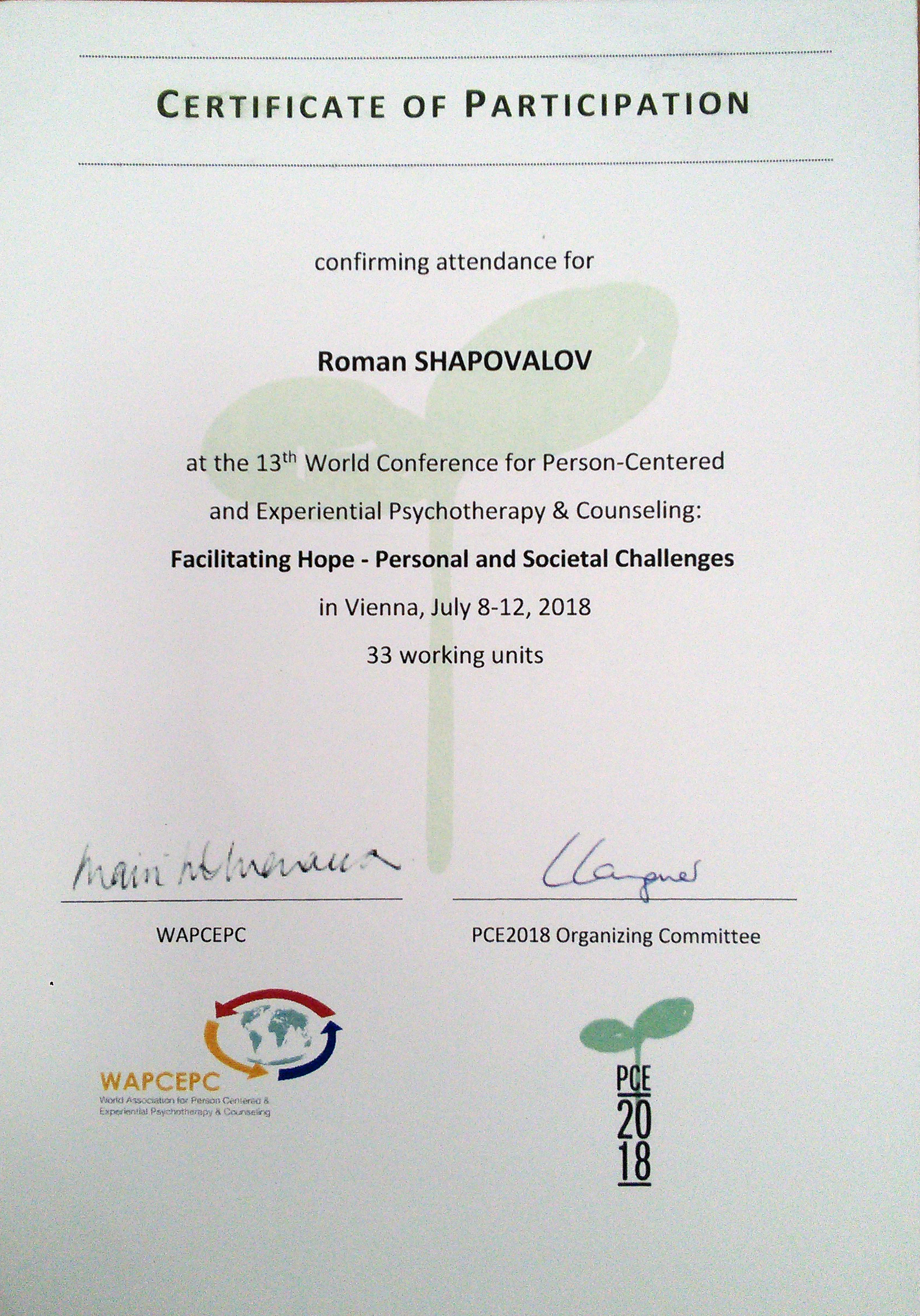 - Мастер-классы 13-го Всемирного конгресса по человекоцентрированной и экспериентальной психотерапии и консультированию "Facilitating Hope - Personal and Societal Challenges", Вена, Австрия, 2018.