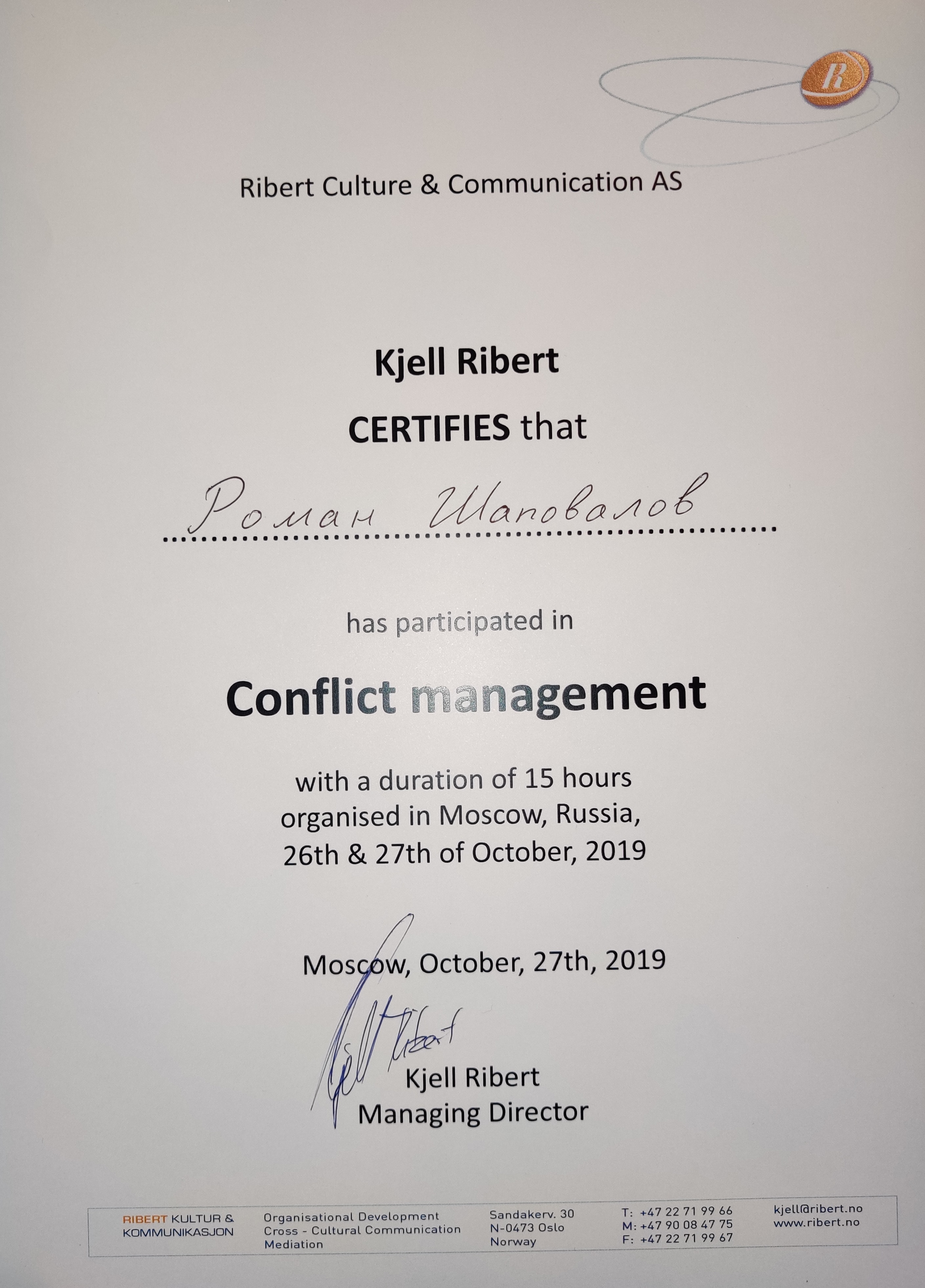- Мастер-класс "Управление конфликтами", 15 часов, Москва, 2019.