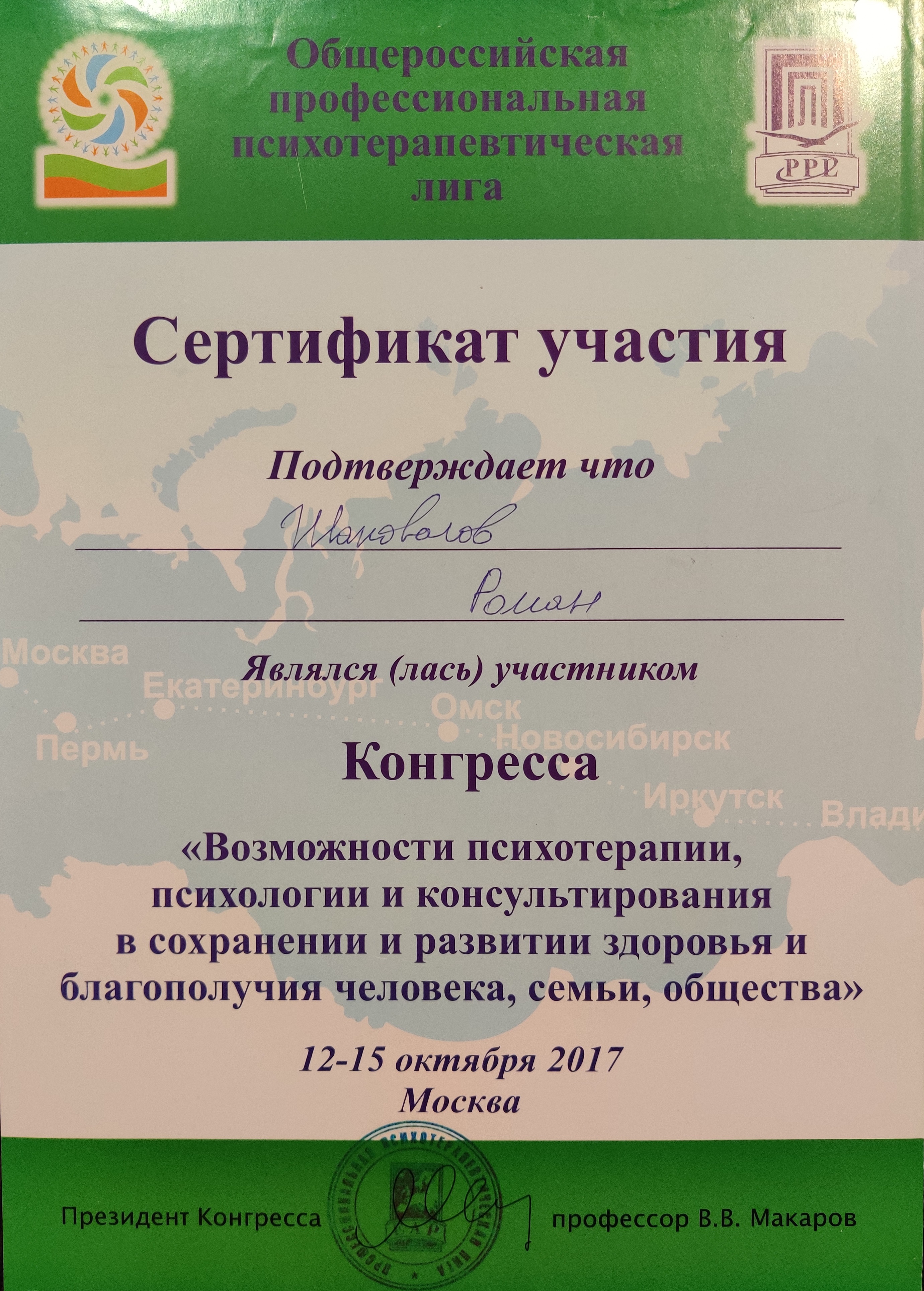 - Конгресс "Возможности психотерапии, психологии и консультирования в сохранении и развитии здоровья и благополучия человека, семьи и общества", Москва, 2017.