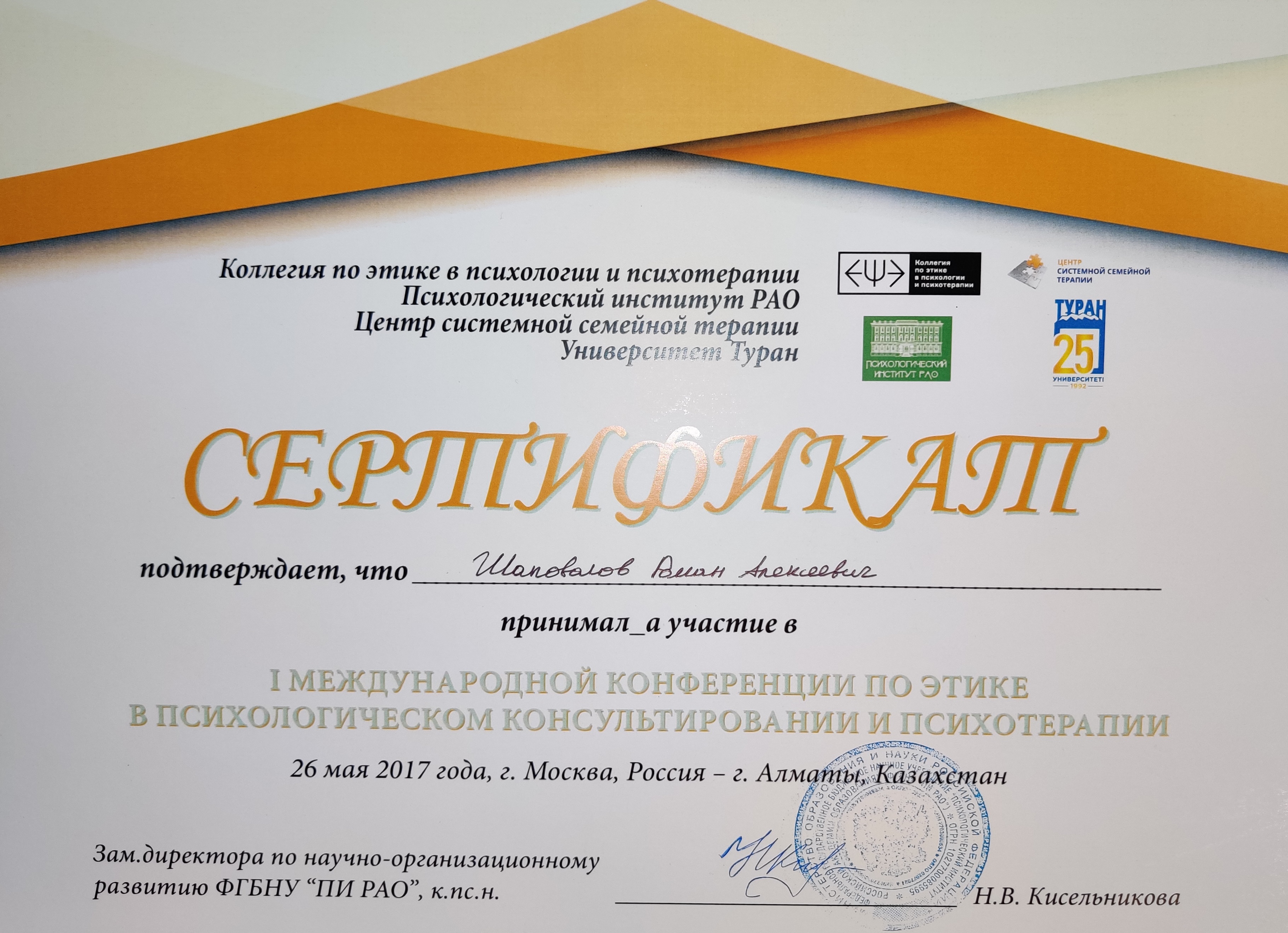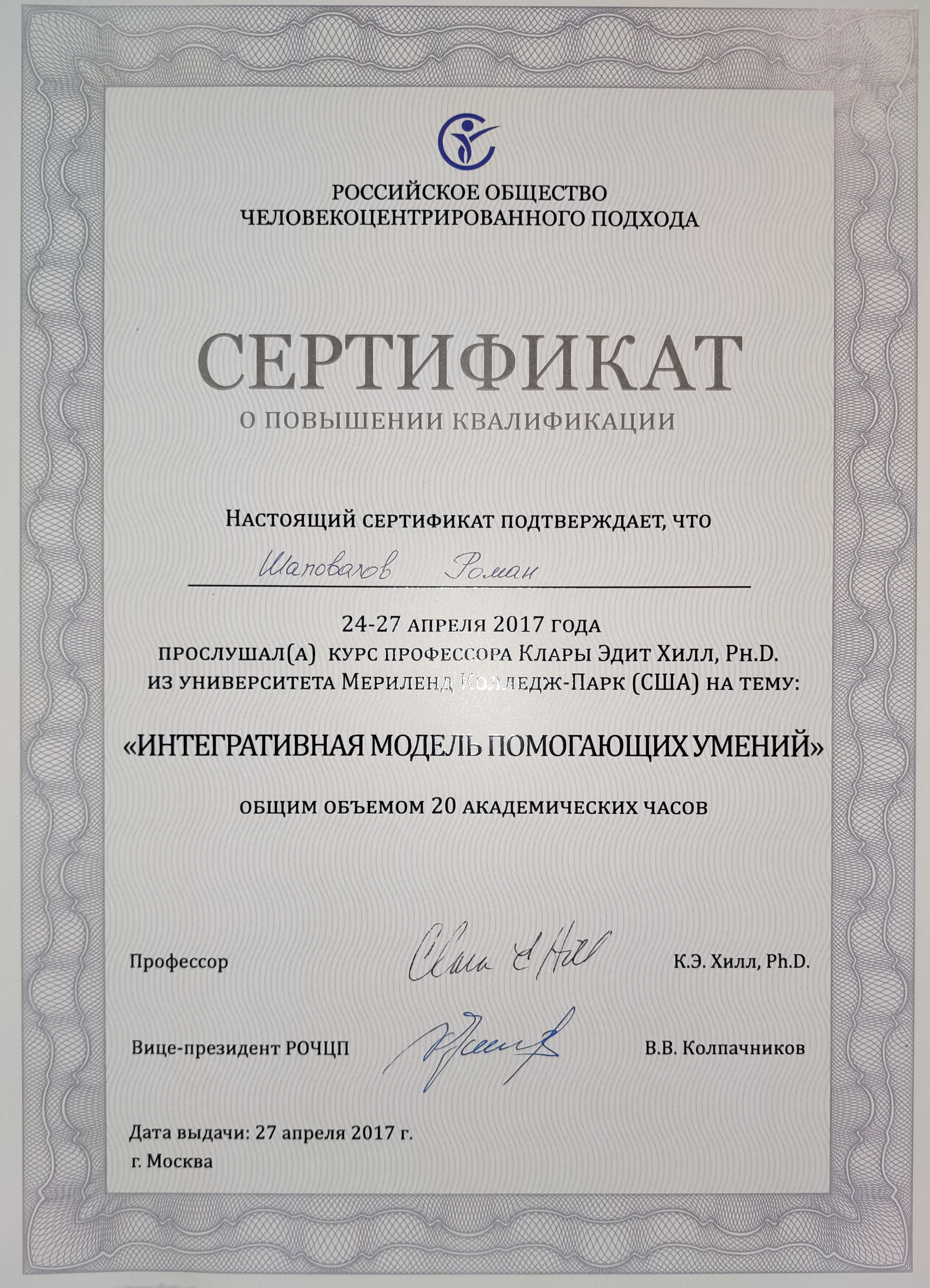 - Повышение квалификации "Интегративная модель помогающих умений", 20 часов, Москва, 2017.