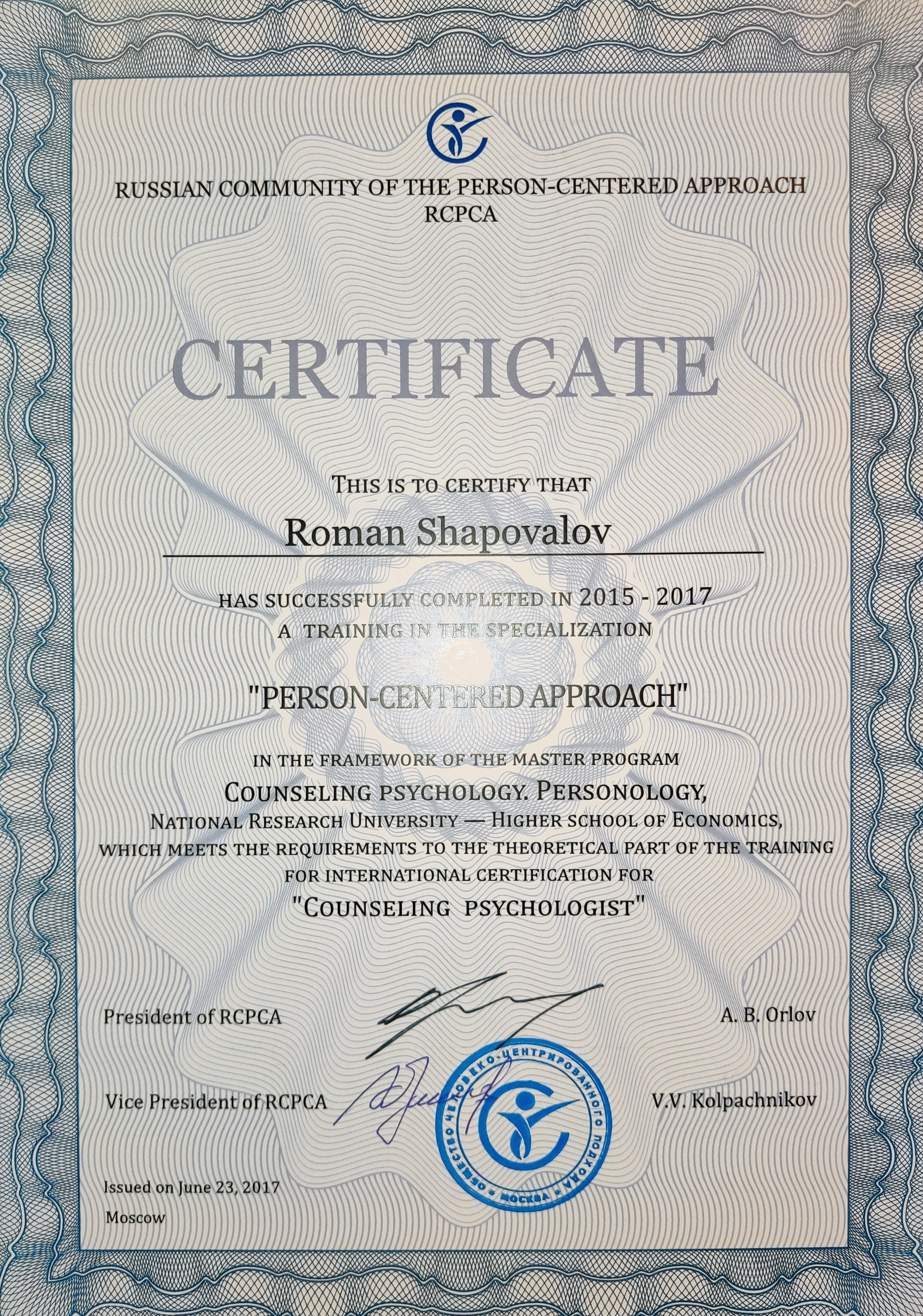 - Специализация "Человекоцентрированный подход" в рамках магистерской программы "Консультативная психология. Персонология" в НИУ ВШЭ, Москва, 2015-2017.