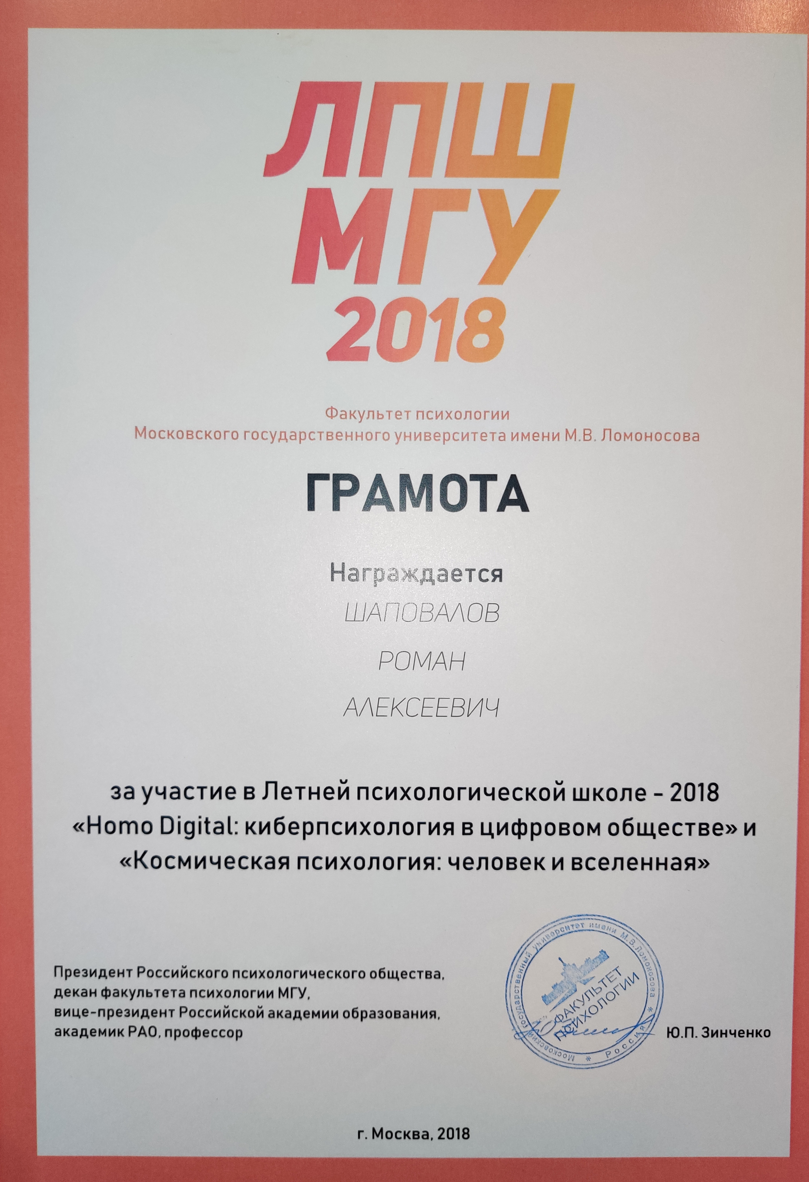 - Летняя психологическая школа "Homo Digital: киберпсихология в цифровом обществе" и "Космическая психология: человек и вселенная", МГУ им. М.В. Ломоносова, Москва, 2018.