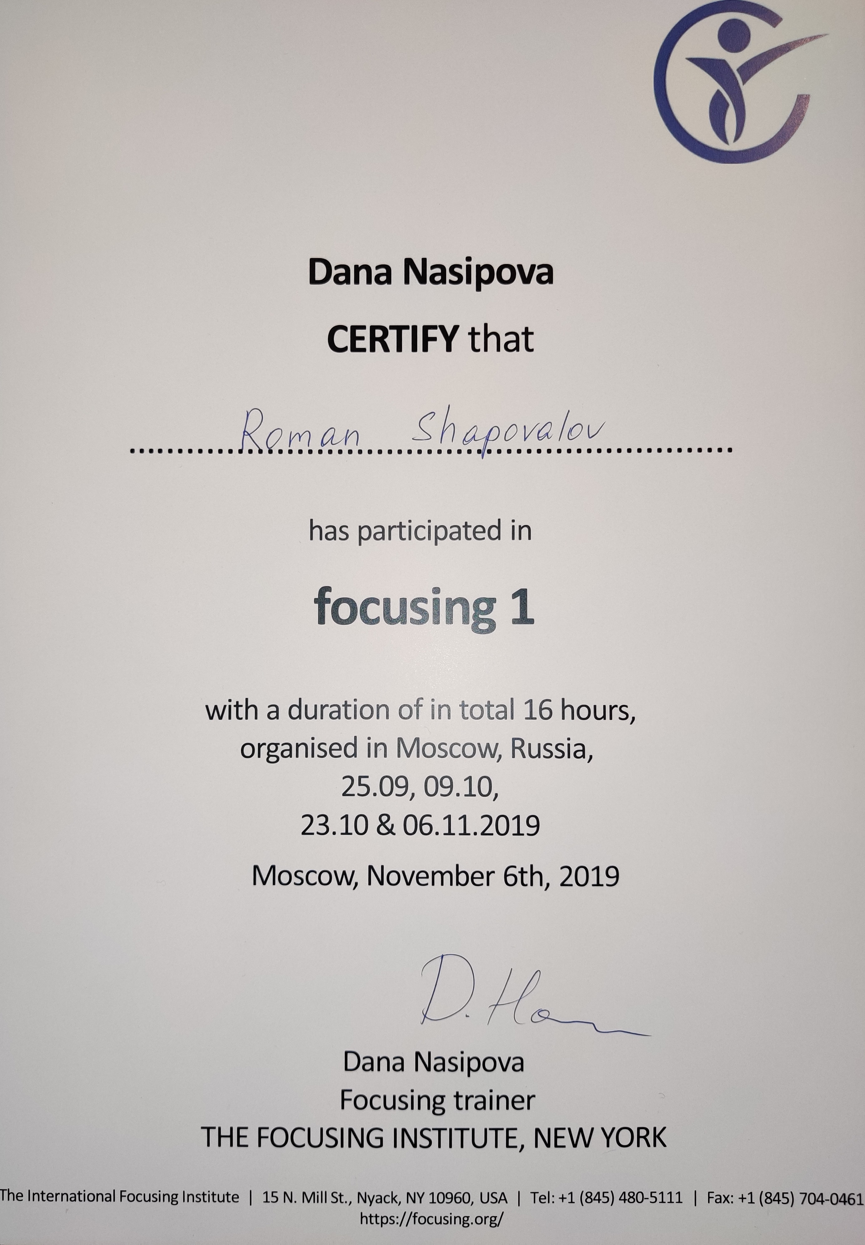 - Обучающая программа по фокусингу "Focusing 1", 16 часов, Москва, 2019.