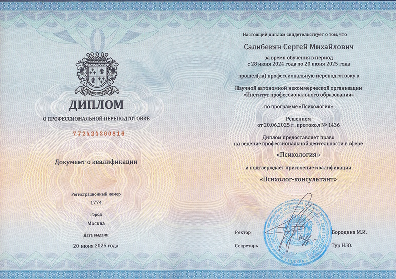 Диплом по профессиональной переподготовке на специальность "Психолог-консультант"