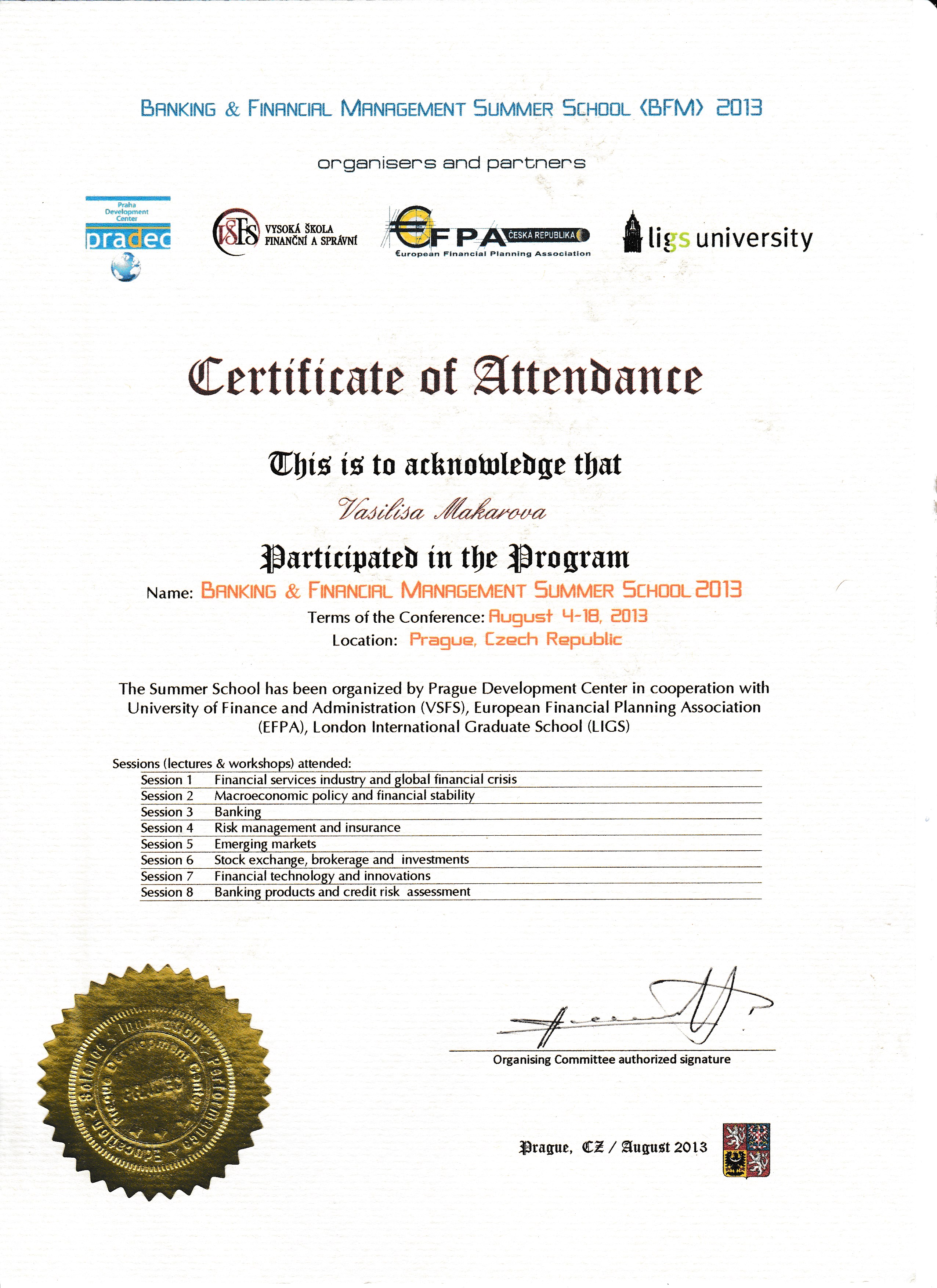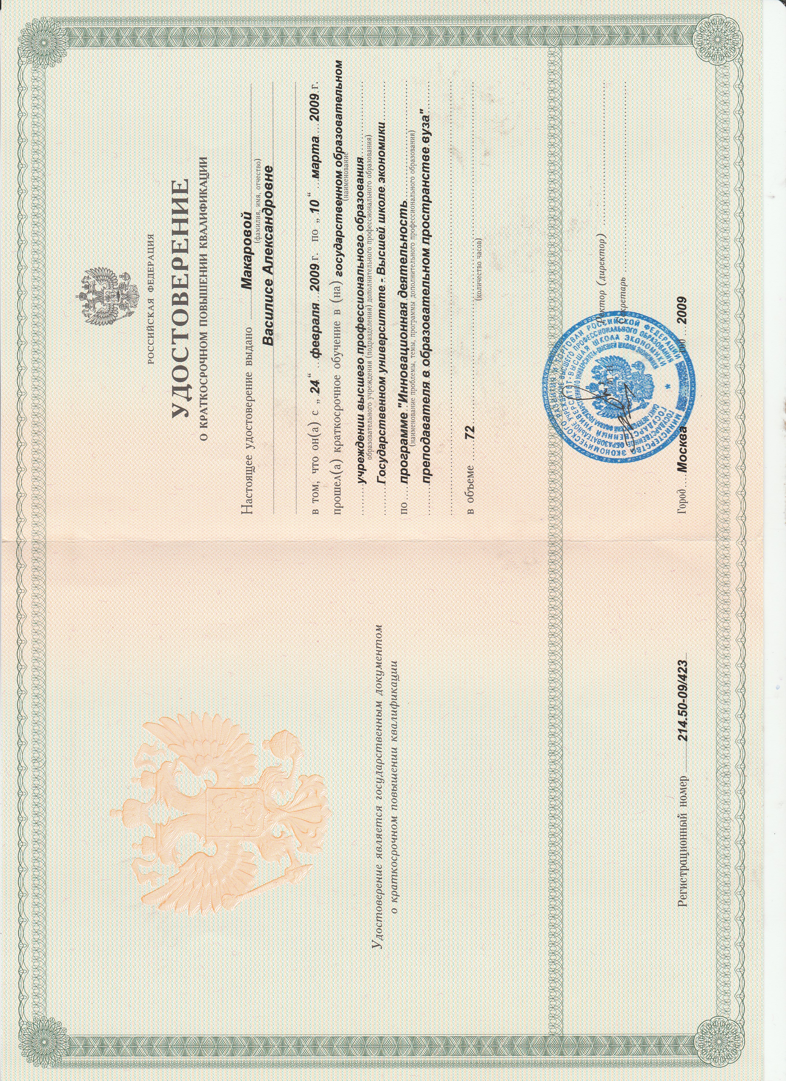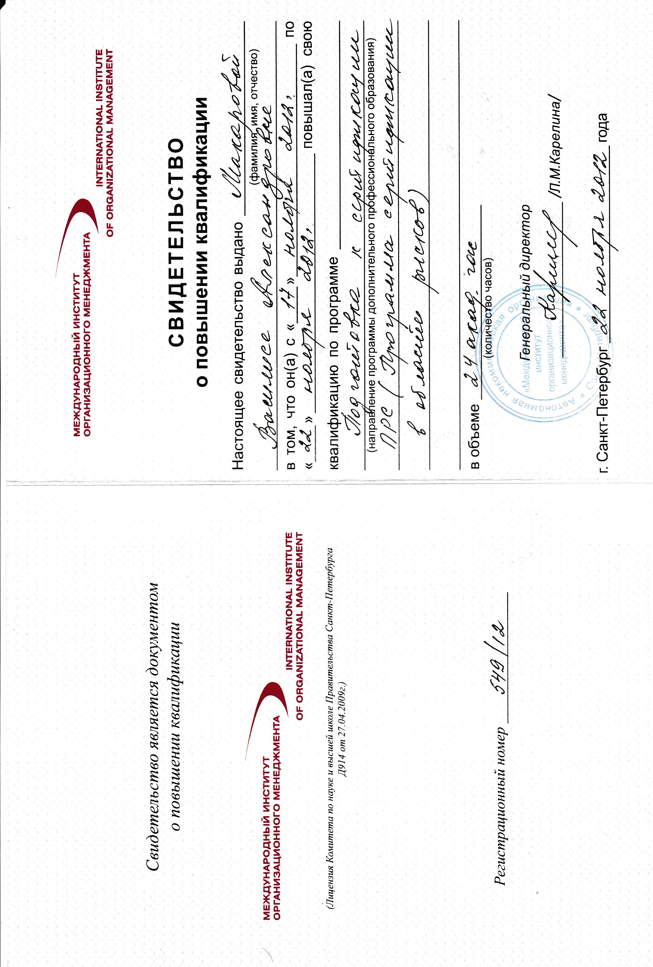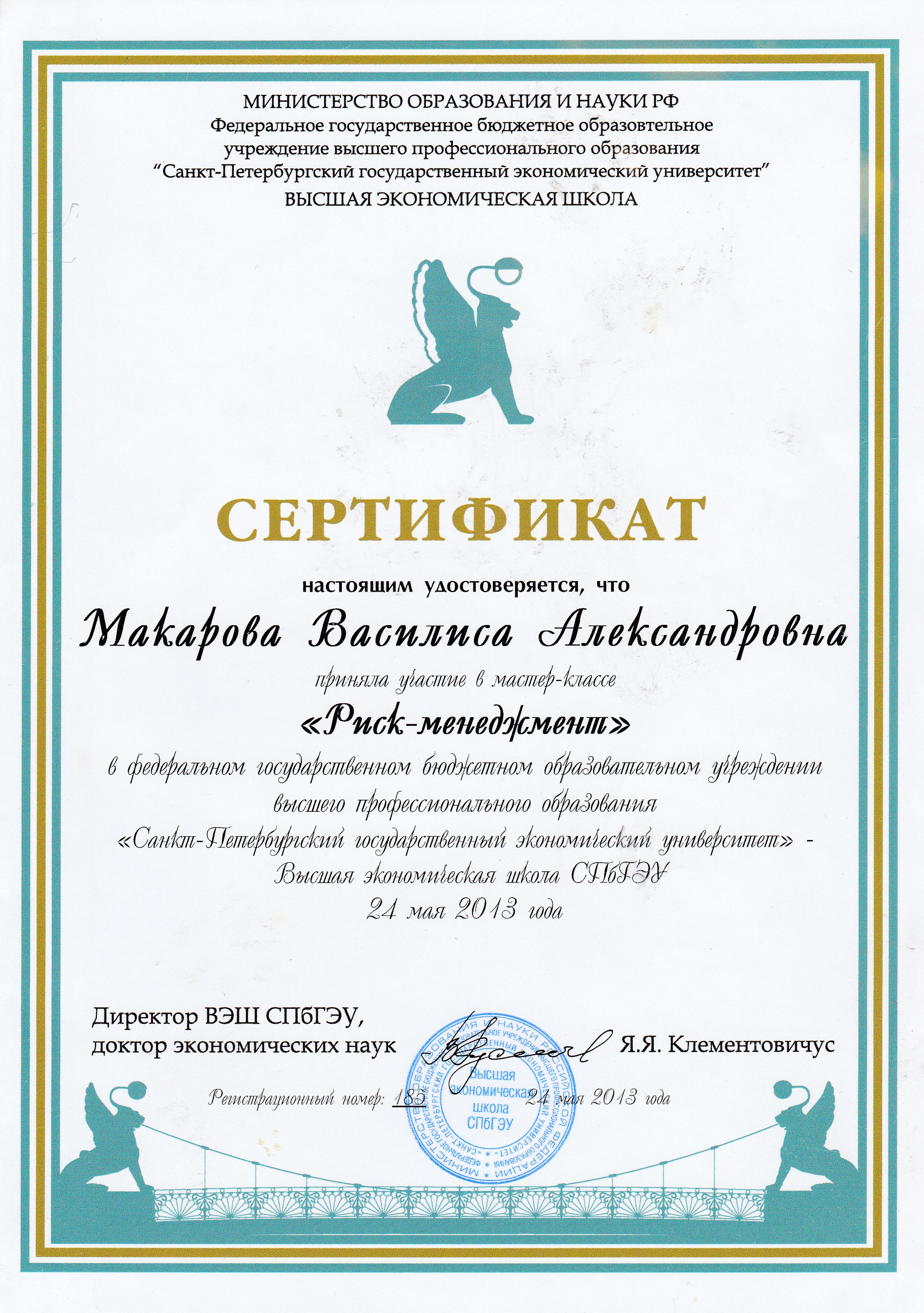 Специалитет: Санкт-Петербургский университет экономики и финансов, специальность «Финансы и кредит», квалификация «Экономист»Дополнительное образование / Повышение квалификации / Стажировки