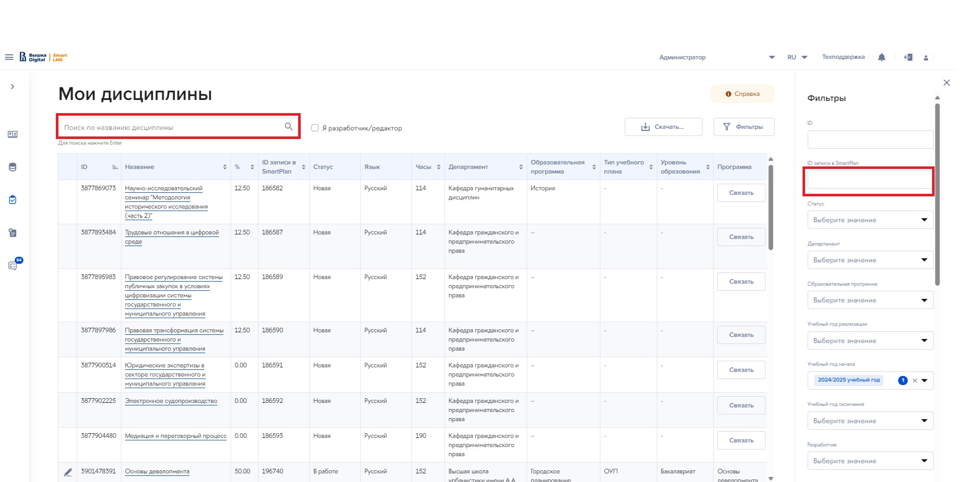 Справа находятся фильтры, которые позволяют осуществлять поиск по различным категориям (статус, департамент, образовательная программа и т. д.).