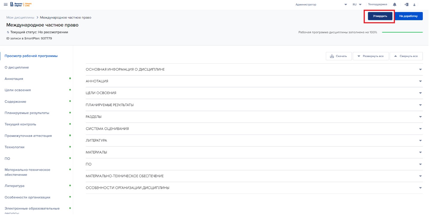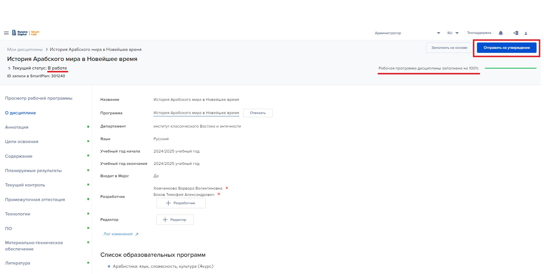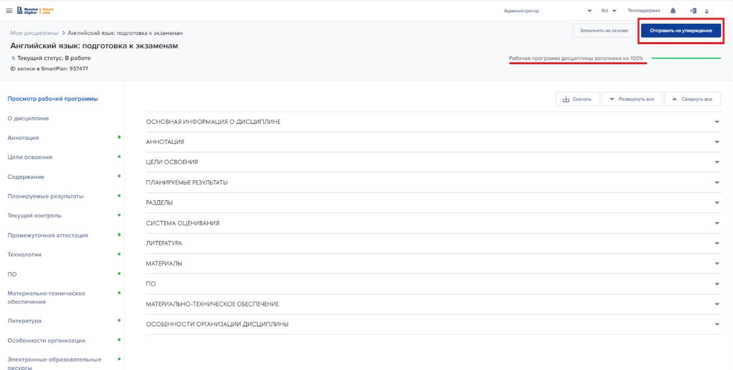При заполнении рабочей программы дисциплины на 100% ее необходимо отправить на утверждение департаменту или образовательной программе.