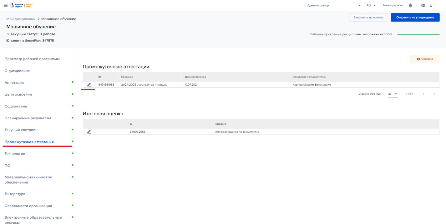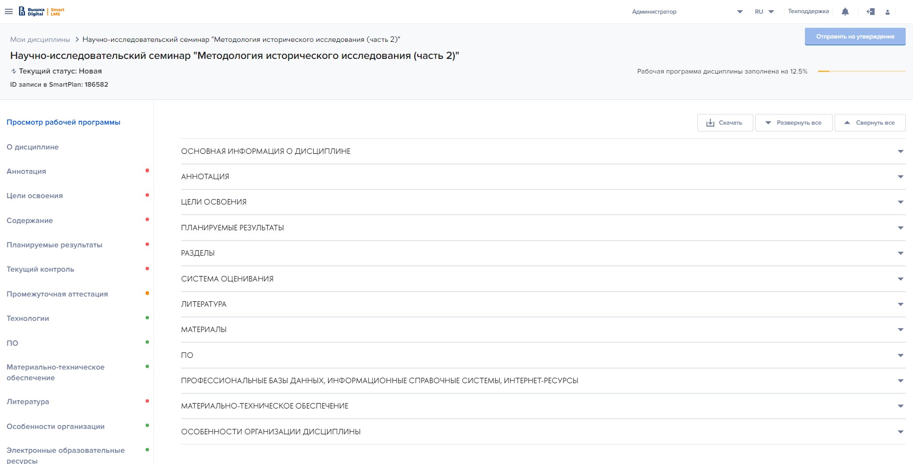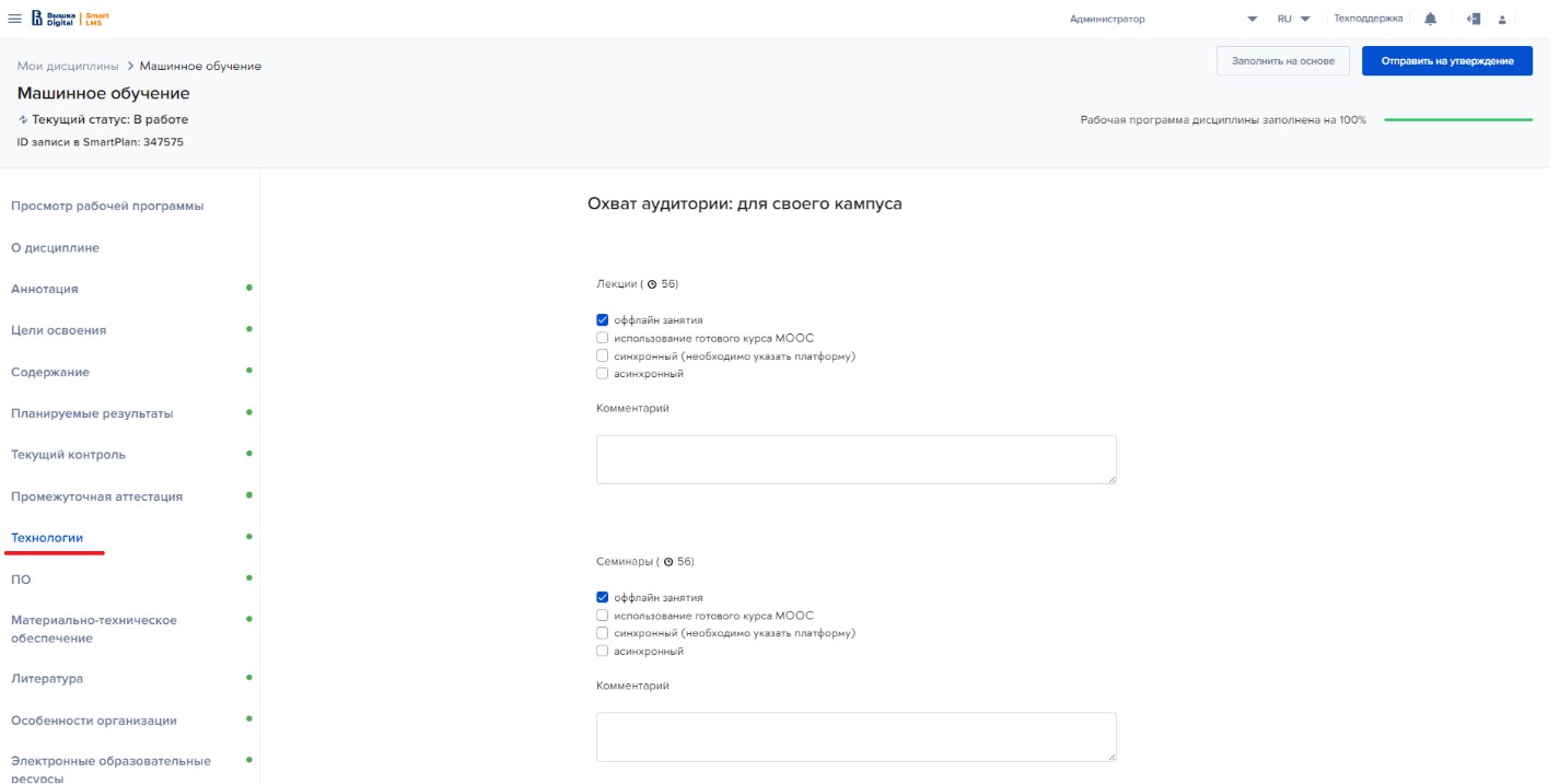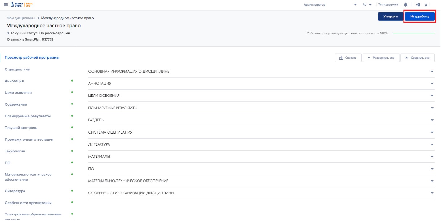 При заполнении рабочей программы дисциплины на 100% ее необходимо отправить на утверждение департаменту или образовательной программе.