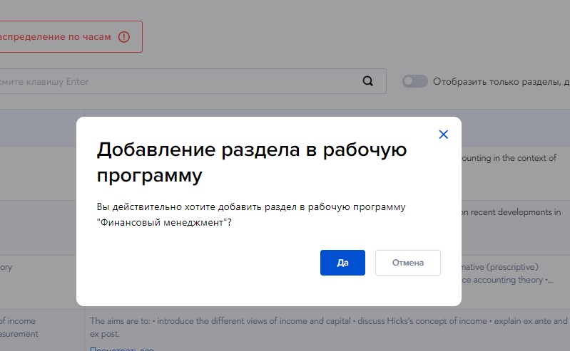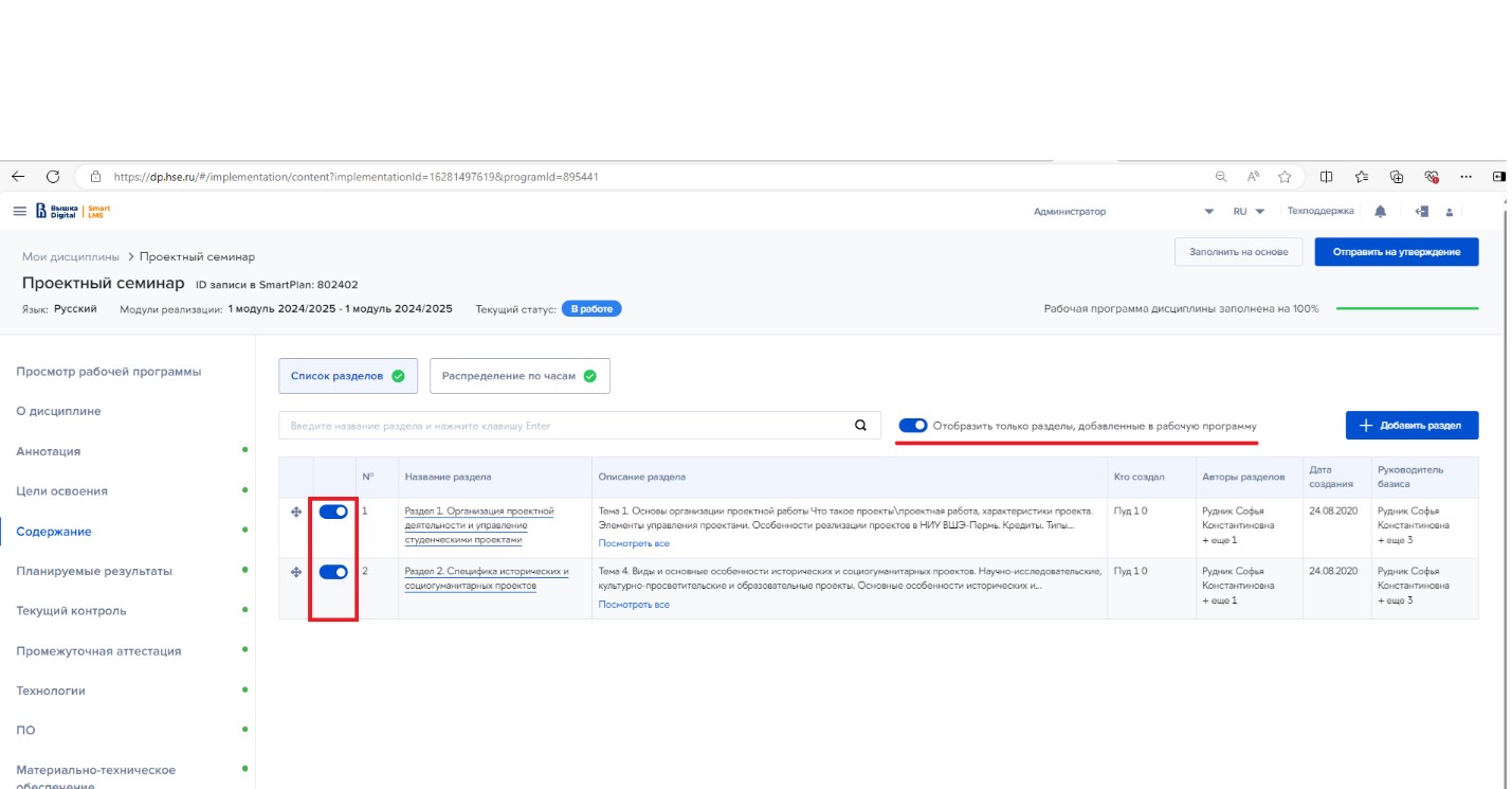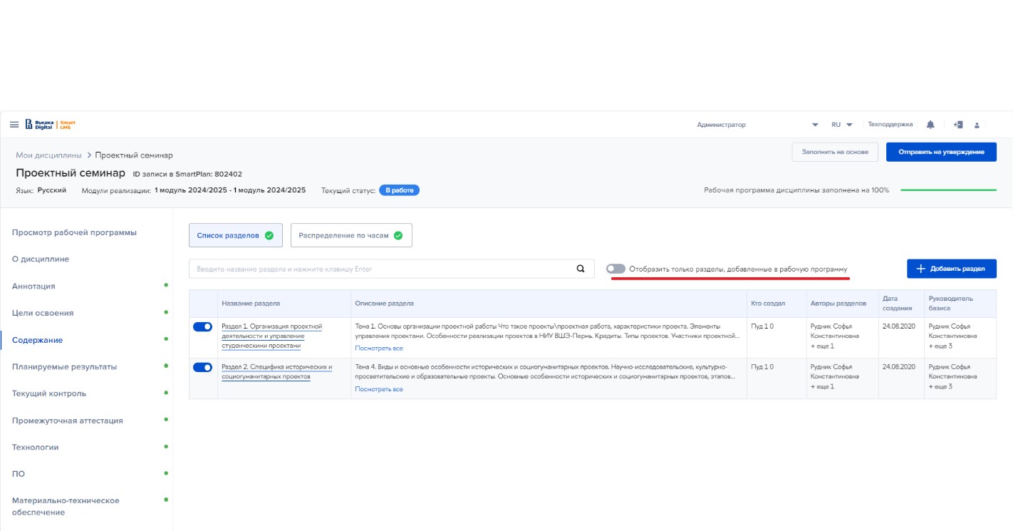Также есть возможность отображать добавленные разделы в рабочую программу дисциплины и все разделы, добавленные в связанную программу, с помощью переключателя «Отобразить только разделы, добавленные в рабочую программу»
